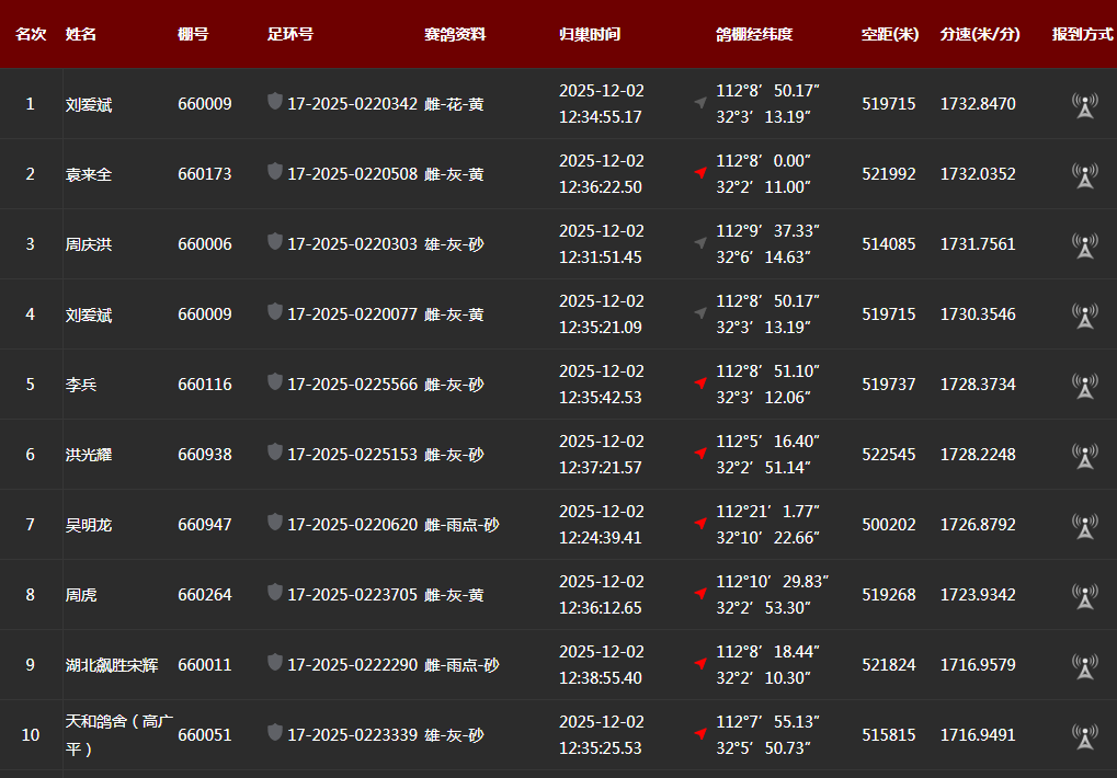 12月02日12点34分,鸽友刘爱斌的一羽赛鸽17-2025-0220342 雌-花-黄,以1732.8470米/分获得冠军。鸽友袁来全的一羽赛鸽17-2025-0220508 雌-灰-黄 ,以1732.0352米/分速获得亚军,鸽友周庆洪的一羽赛鸽17-2025-0220303 雄-灰-砂,以1731.7561米/分获得季军。