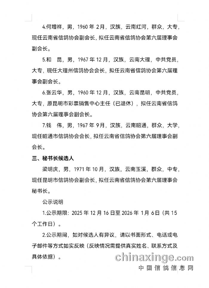 云南省信鸽协会第六届理事会负责人建议人选公示通知