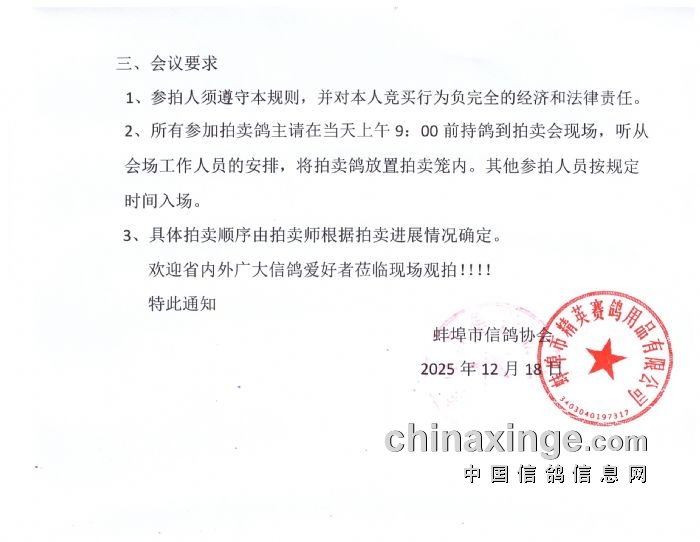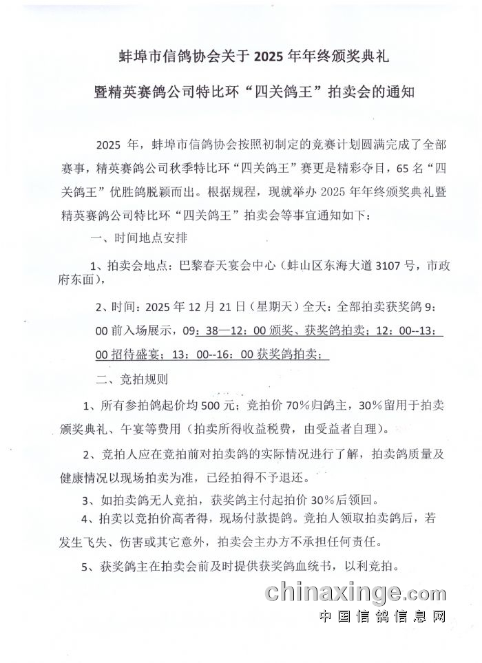 蚌埠市信鸽协会关于2025年年终颁奖典礼暨精英赛鸽公司特比环“四关鸽王”拍卖会的通知