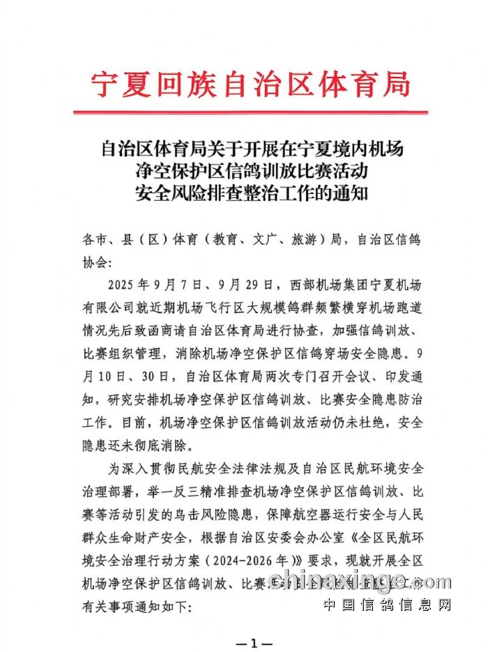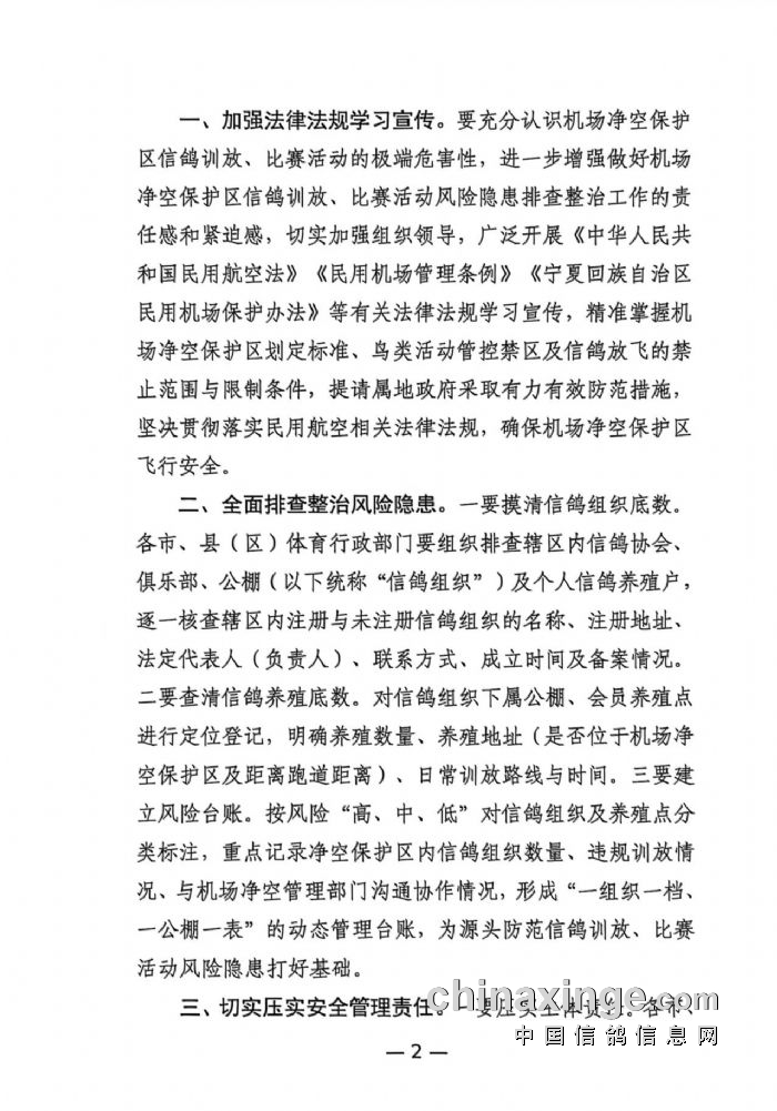 自治区体育局关于开展在宁夏境内机场净空保护区信鸽训放比赛活动安全风险排查整治工作的通知