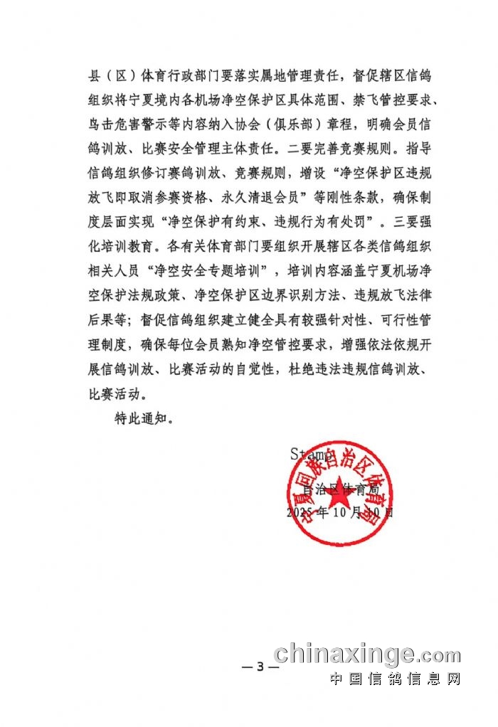 自治区体育局关于禁止在宁夏境内机场 净空保护区饲养放飞信鸽的通知