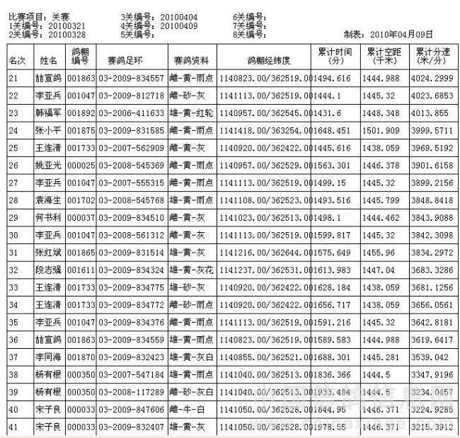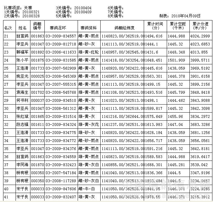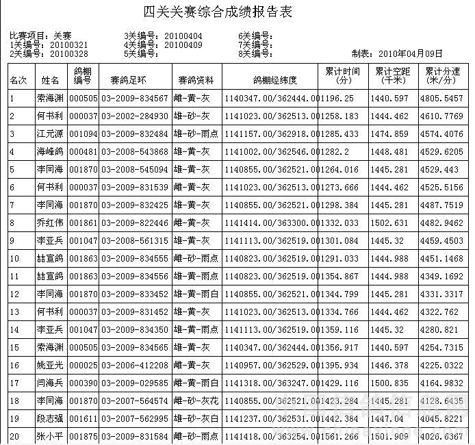 邯郸市信鸽协会峰峰分会四关综合成绩