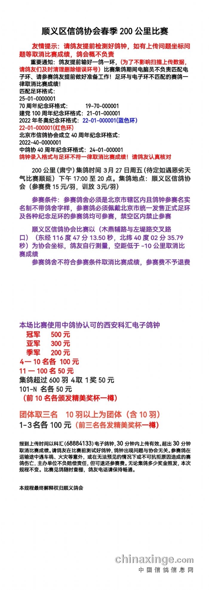顺义区信鸽协会200公里比赛规程
