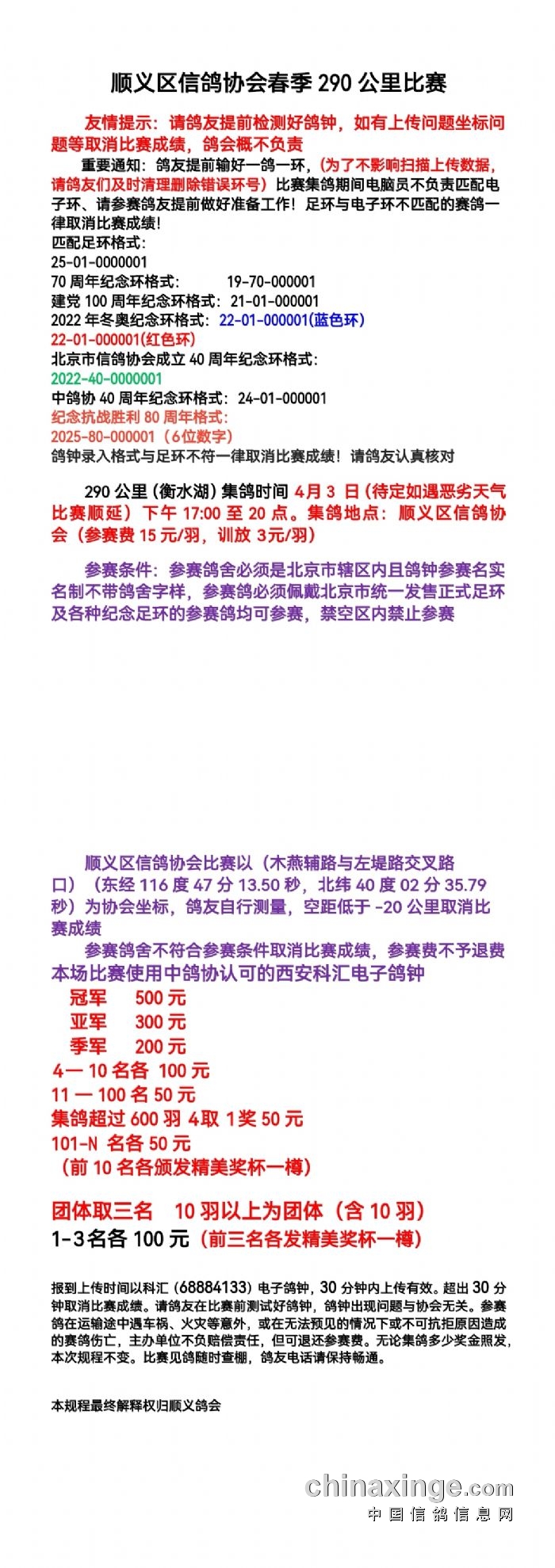 顺义区信鸽协会春季290公里比赛规程