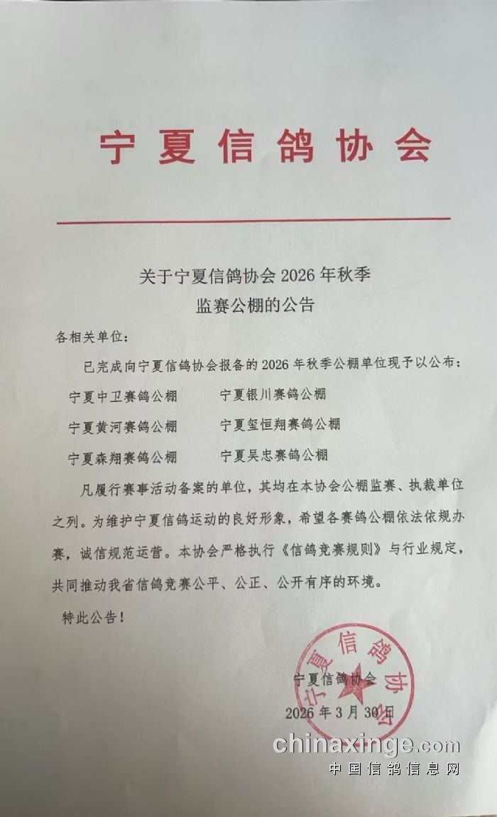 宁夏信鸽协会2026年秋季监赛公告