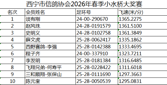 西宁市信鸽协会2026春季小水桥大奖赛前十位风采