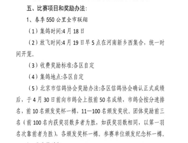 参加单场大兴赛区北京市联翔比赛的会员,比赛结束后鸽会统一上报成绩可参加北京市联翔双关赛排名(要求:必须参加市联翔550公里和国家赛550公里两场赛事的会员,请赛后与鸽会联系)