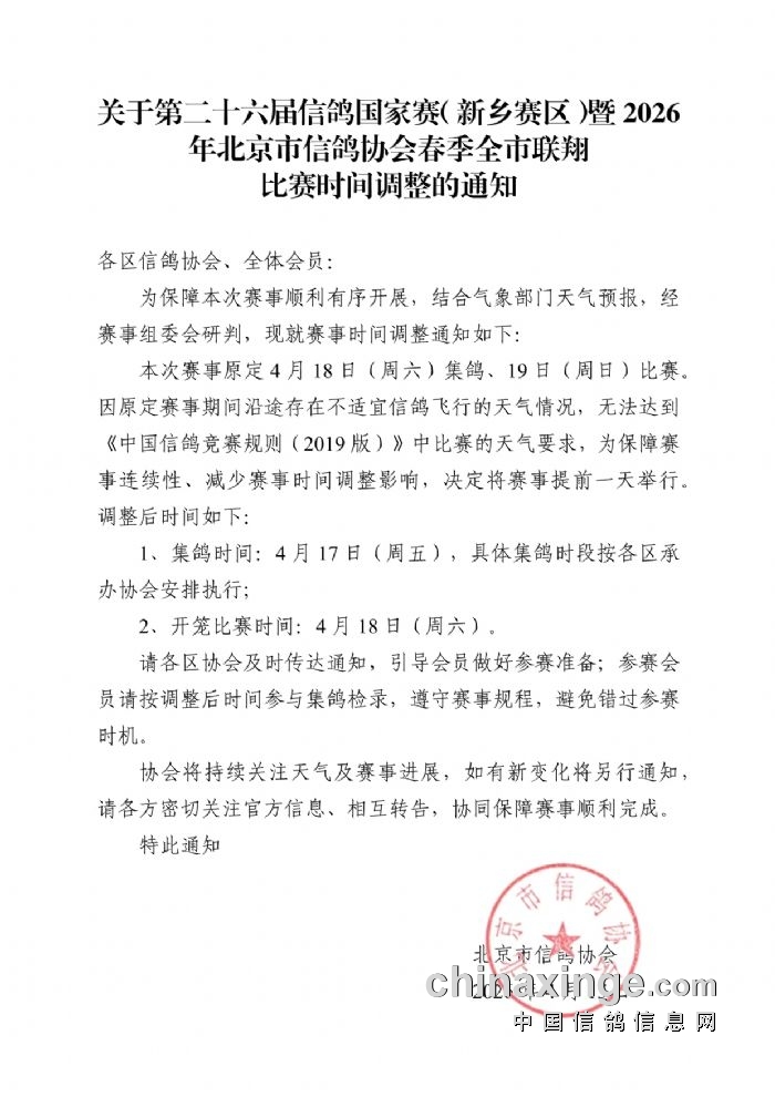 接市鸽会通知,全市联翔原定18日集鸽,因天气原因改为17日集鸽,集鸽时间下午1点至4点,18日放飞。请互相转告谢谢!!