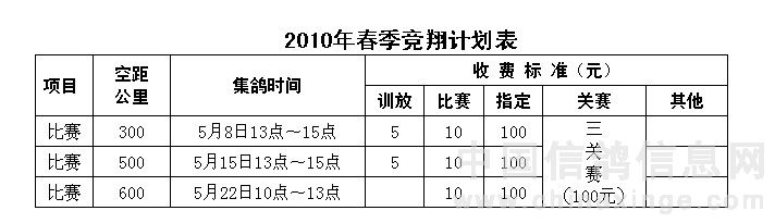 1、2010年1月1日制定的“2010年春季竞翔计划表”废止。 2、凡套带09年大连市信鸽协会发放的足环均可参赛,三关综合前十名发奖杯,前贰佰名发奖金、奖状。第一名3万元,第二名2万元,第三名1万元,4-10名各3000元,11-50名各700元,51-100名各600元,101-200名各500元。 3、为纪念大连市信鸽协会成立二十五周年特制金足环30枚分配如下:三关赛每关前三名各奖1枚,三关综合前21名各奖1枚。 4、凡使用手动鸽钟不准参加关赛和指定鸽赛。 5、执行本年度规程。