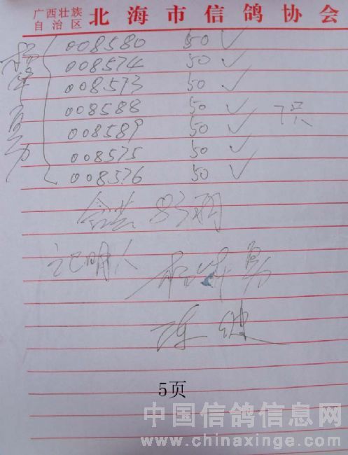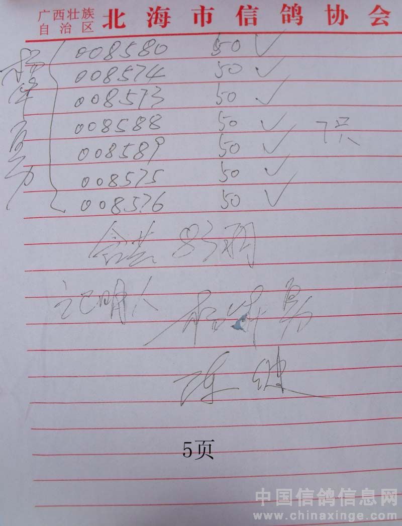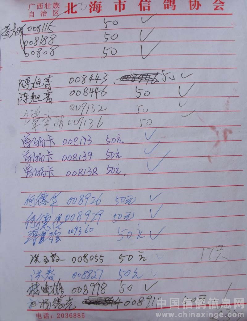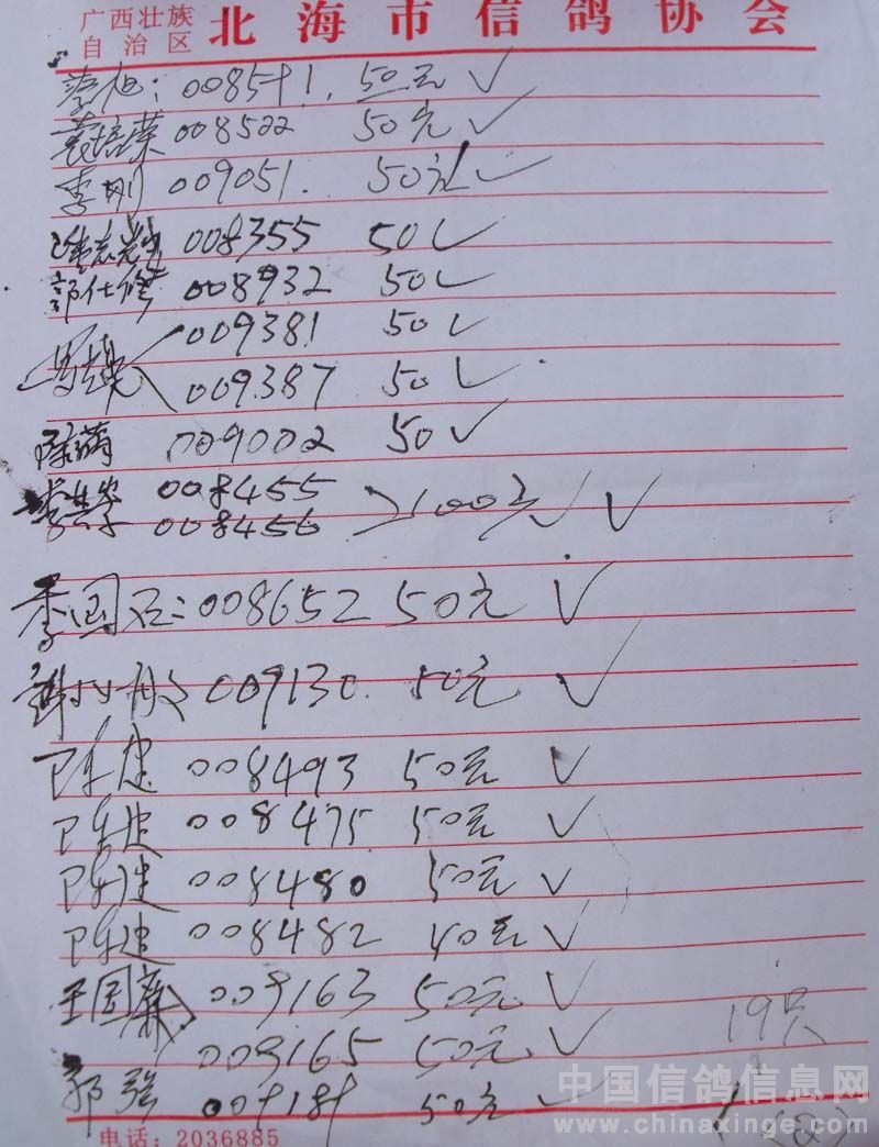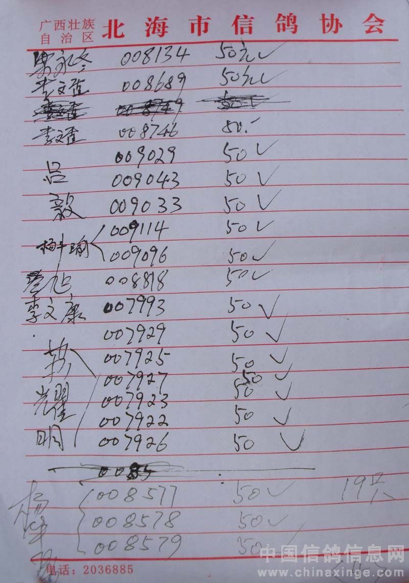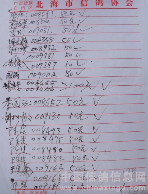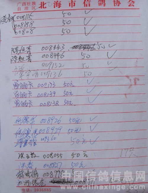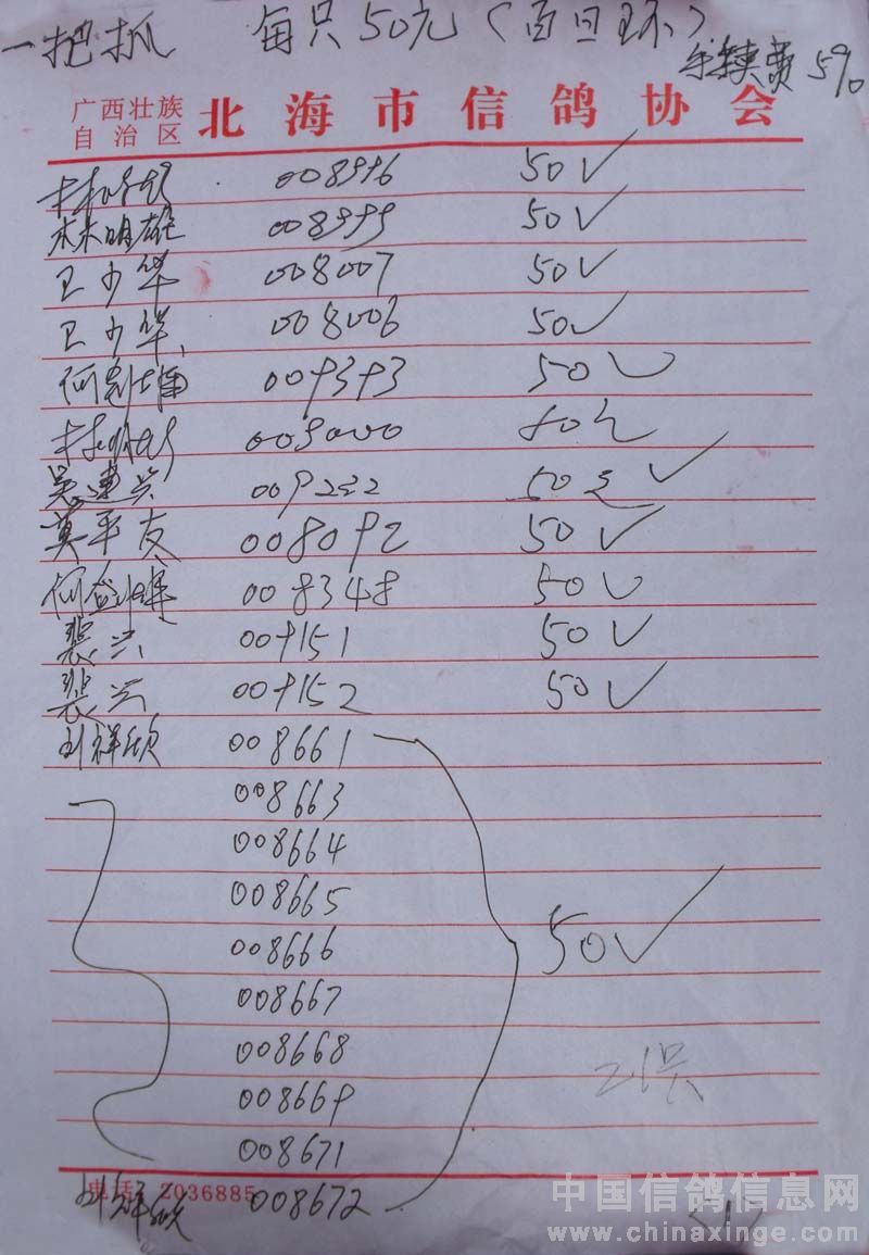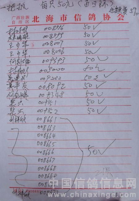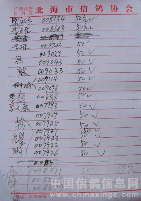 广西北海市信鸽协会2010年上半年阳江站百日龄鸽50元组指定鸽名单