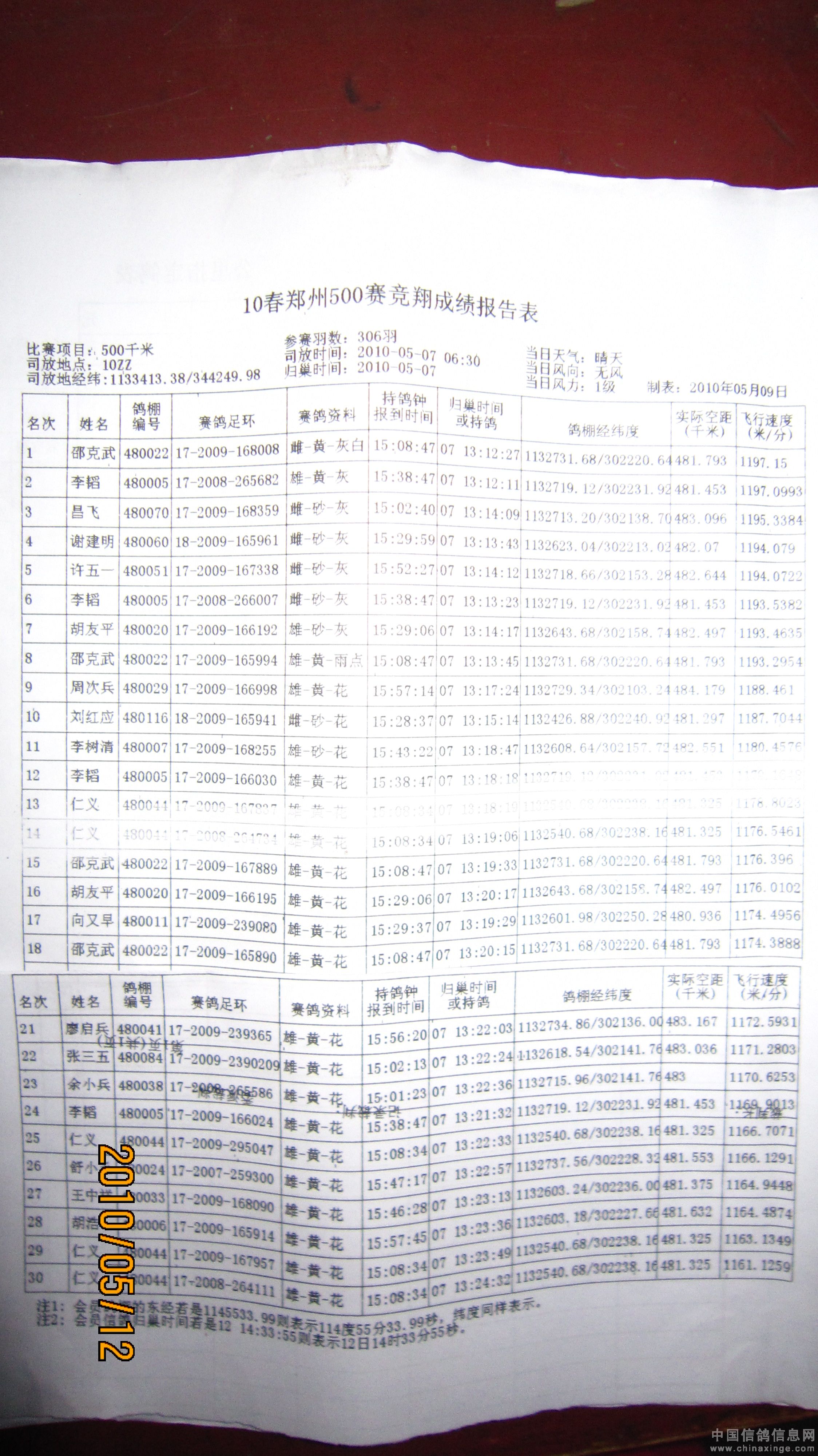 仙桃市信鸽协会2022春第二关郑州报到数据