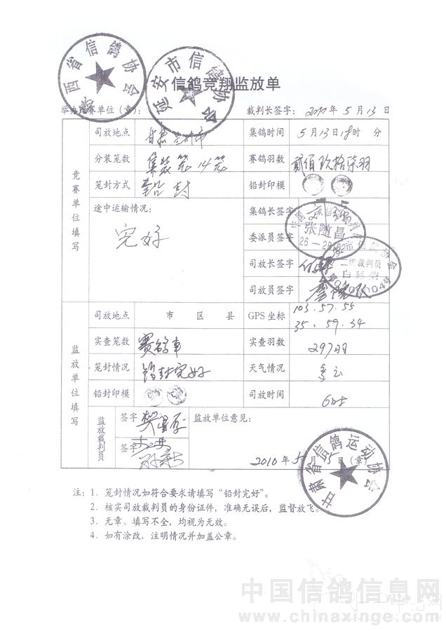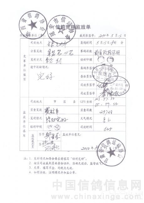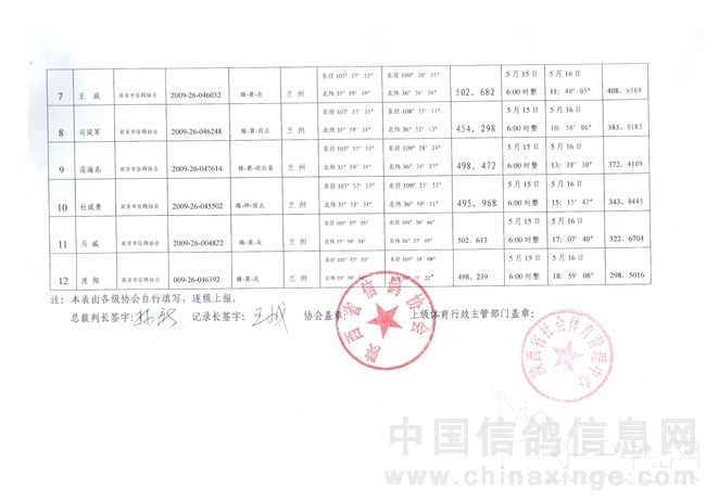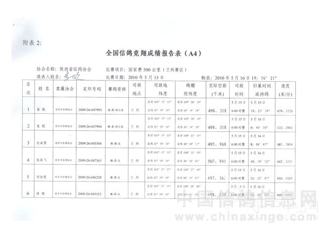 陕西省信鸽协会第十一届国家赛(兰州赛区)500公里成绩报告表