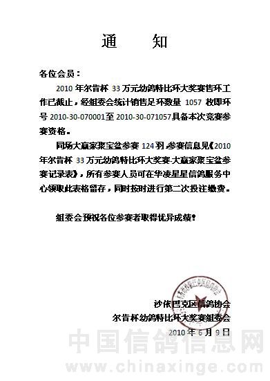 2011年第三届尔肯杯幼鸽特比环大奖赛-决赛成绩报告表