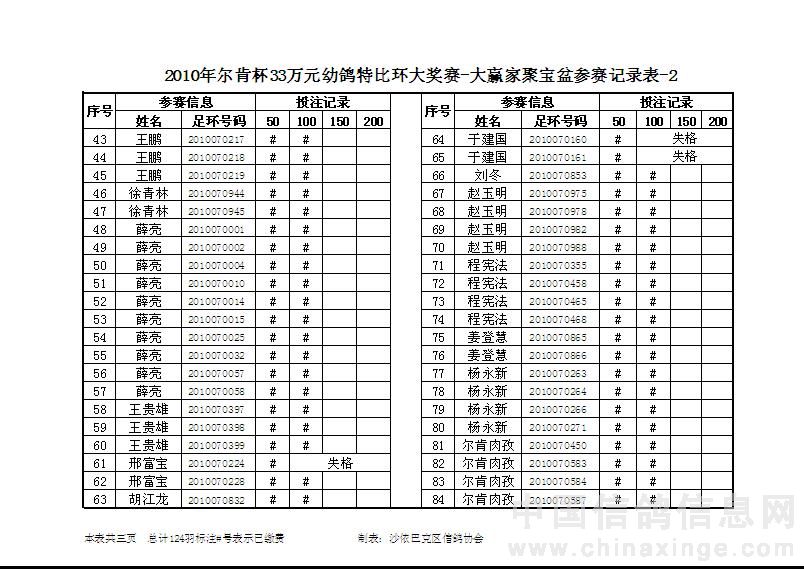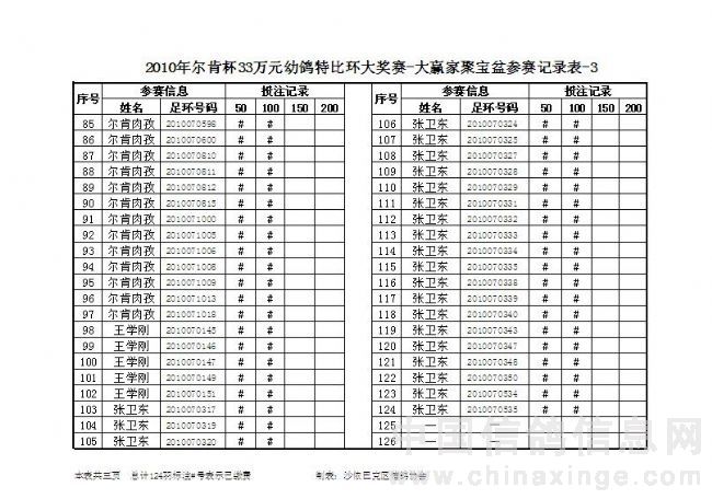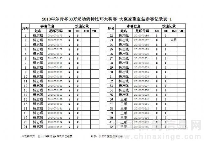 2010年尔肯杯33万元幼鸽特比环大奖赛(聚宝盆第二次缴费信息)可点击放大观看