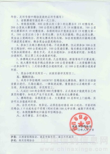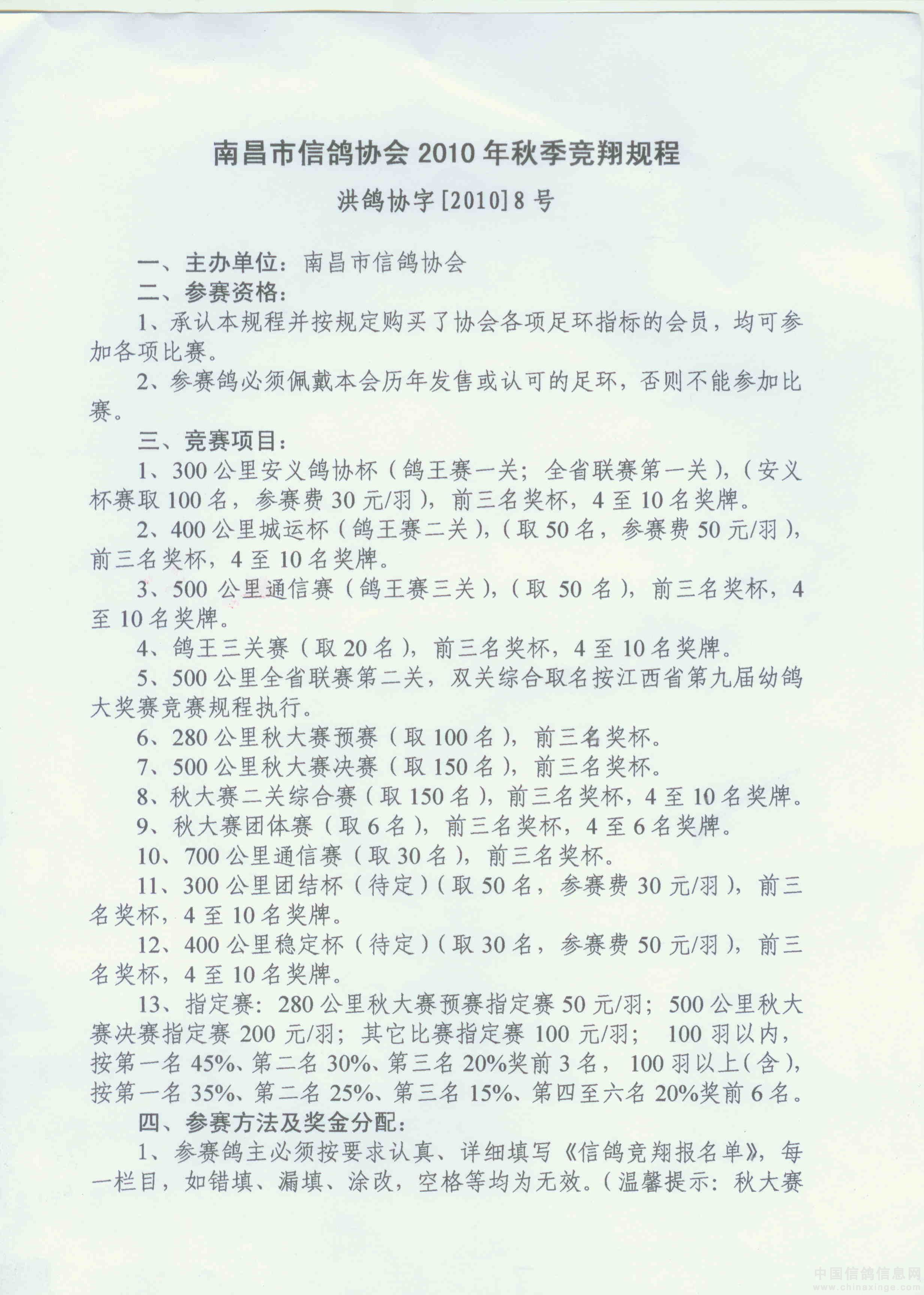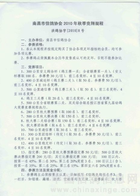 南昌市信鸽协会2010年秋季竞翔规程