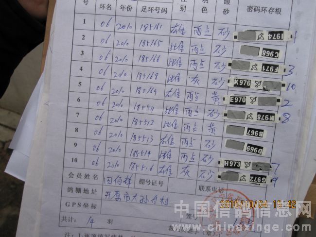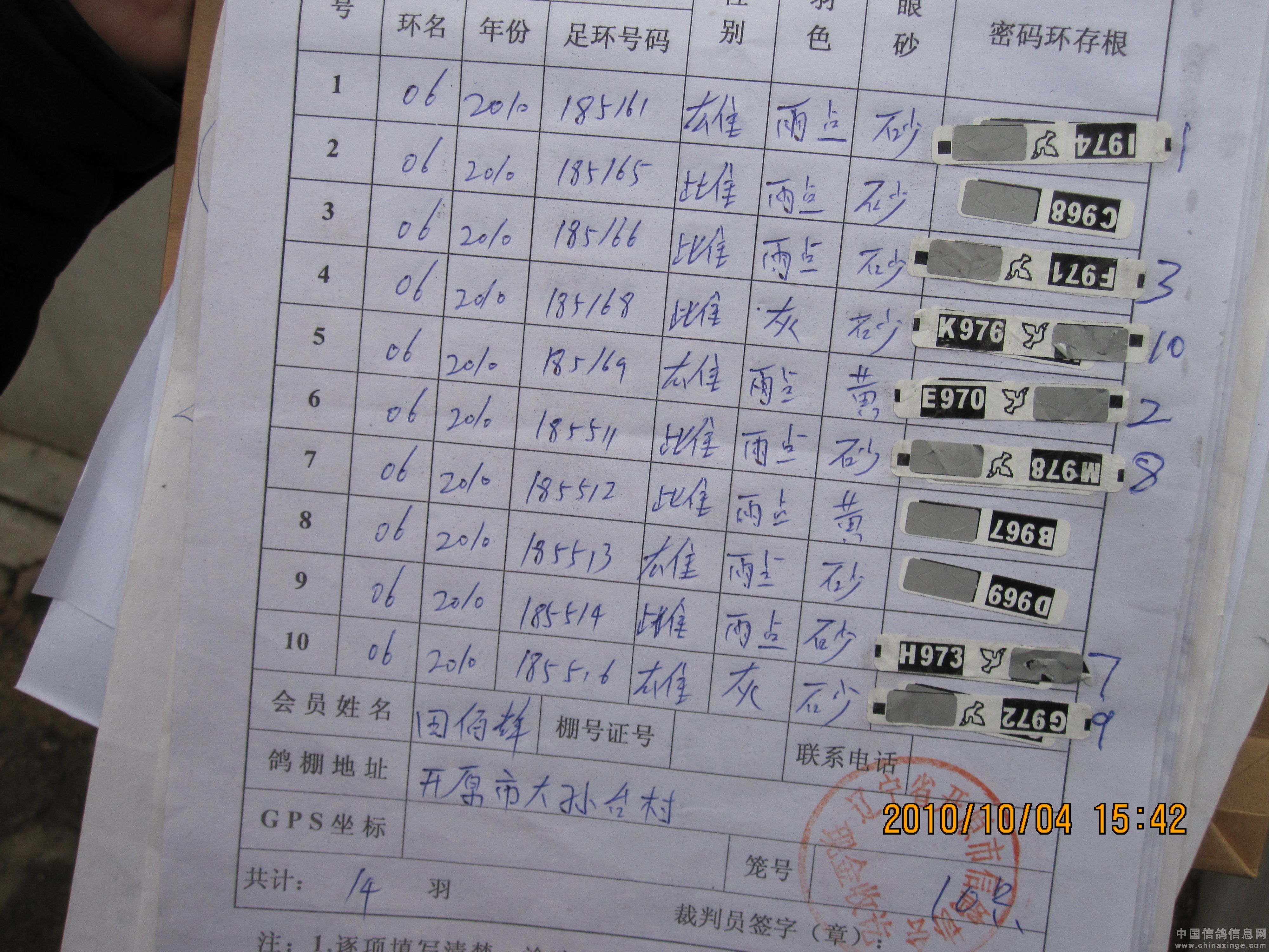 开原市信鸽协会500公里大奖赛第五名。第七名验棚照片