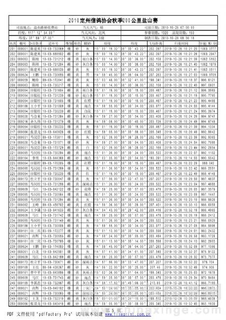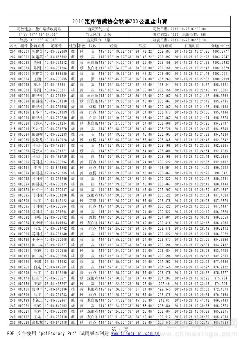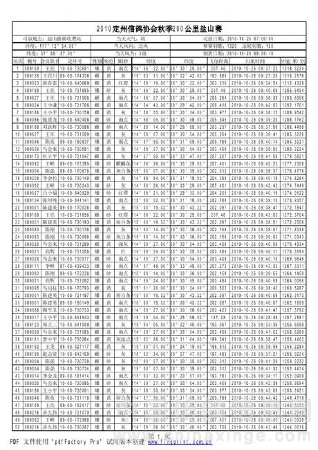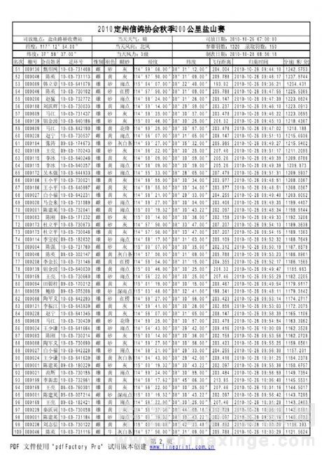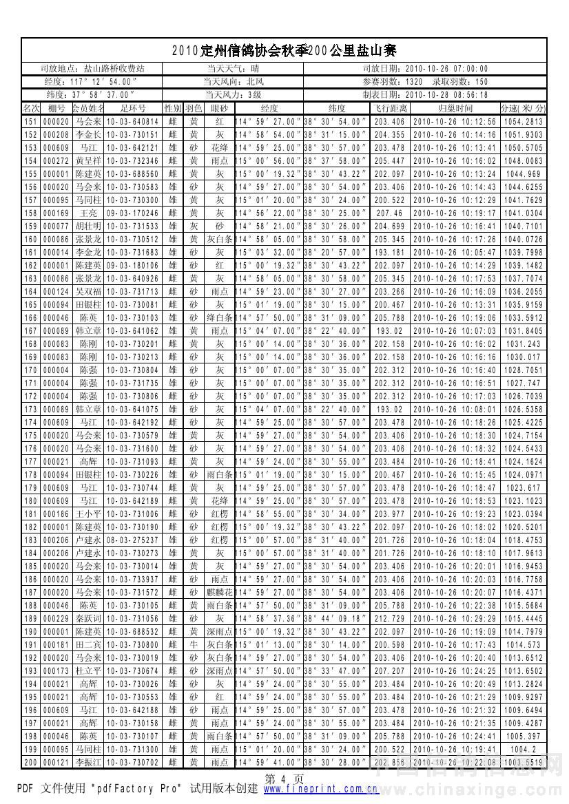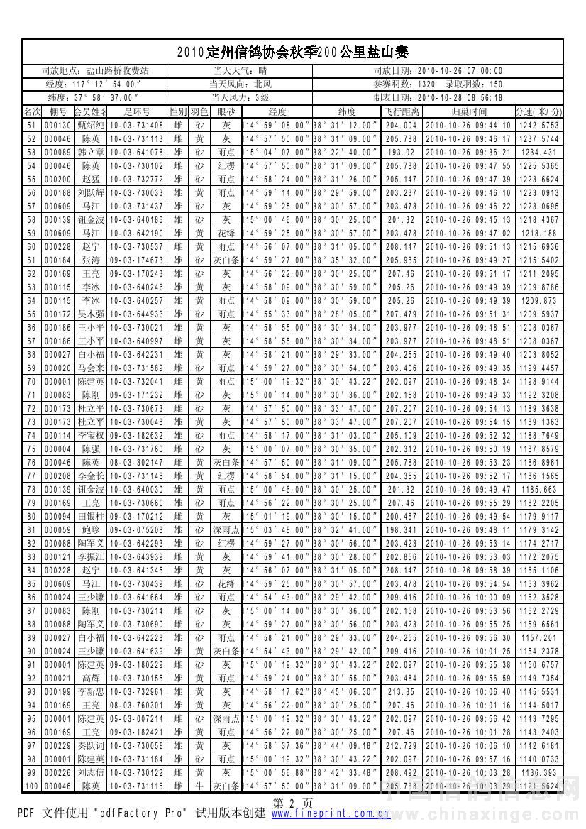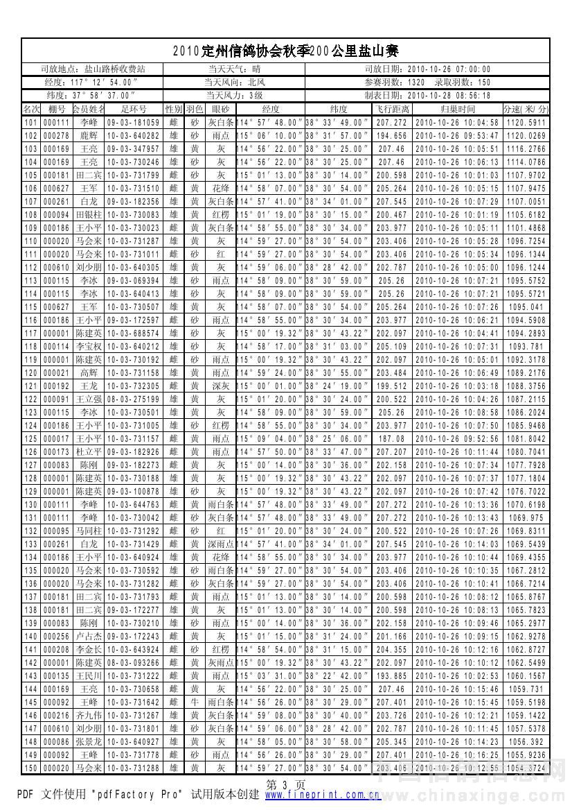 2010年秋季鸽王赛200km获奖资格名单