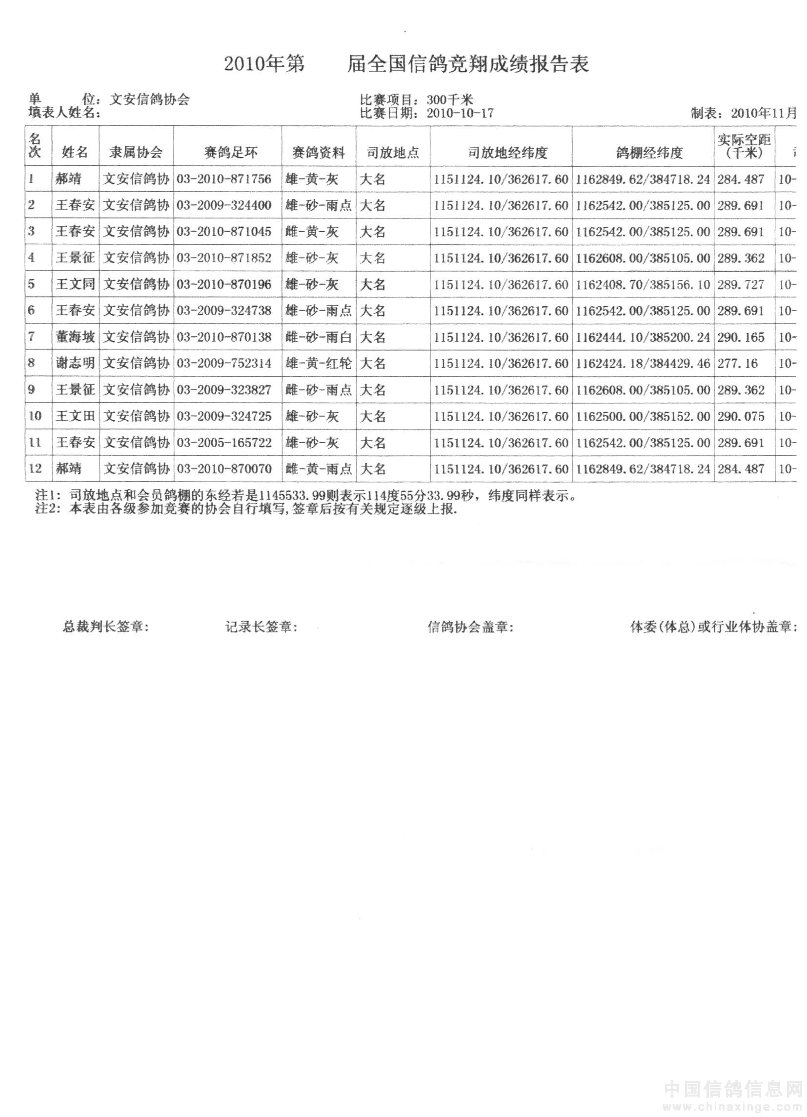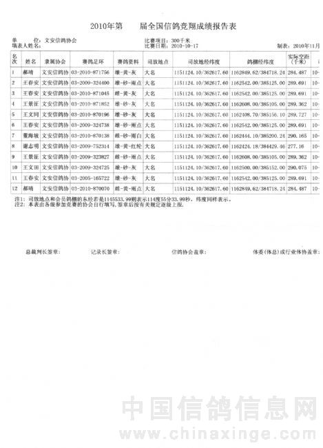 2010年300公里秋季比赛成绩单