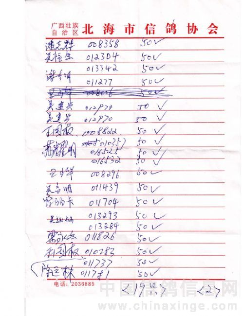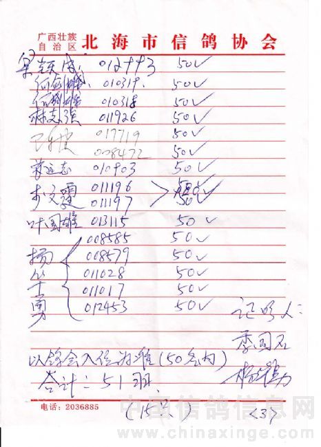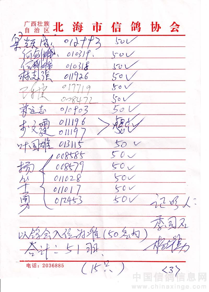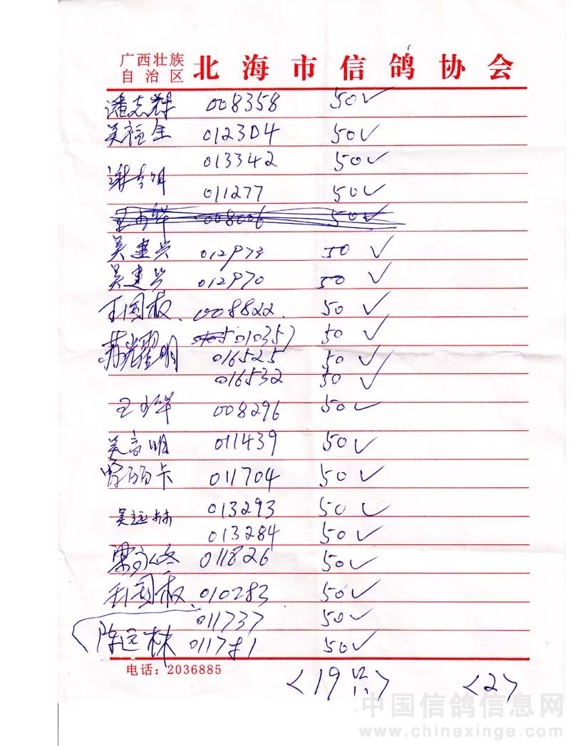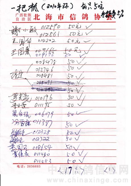 广西北海市信鸽协会2010年下半年陆丰站50元指定鸽名单