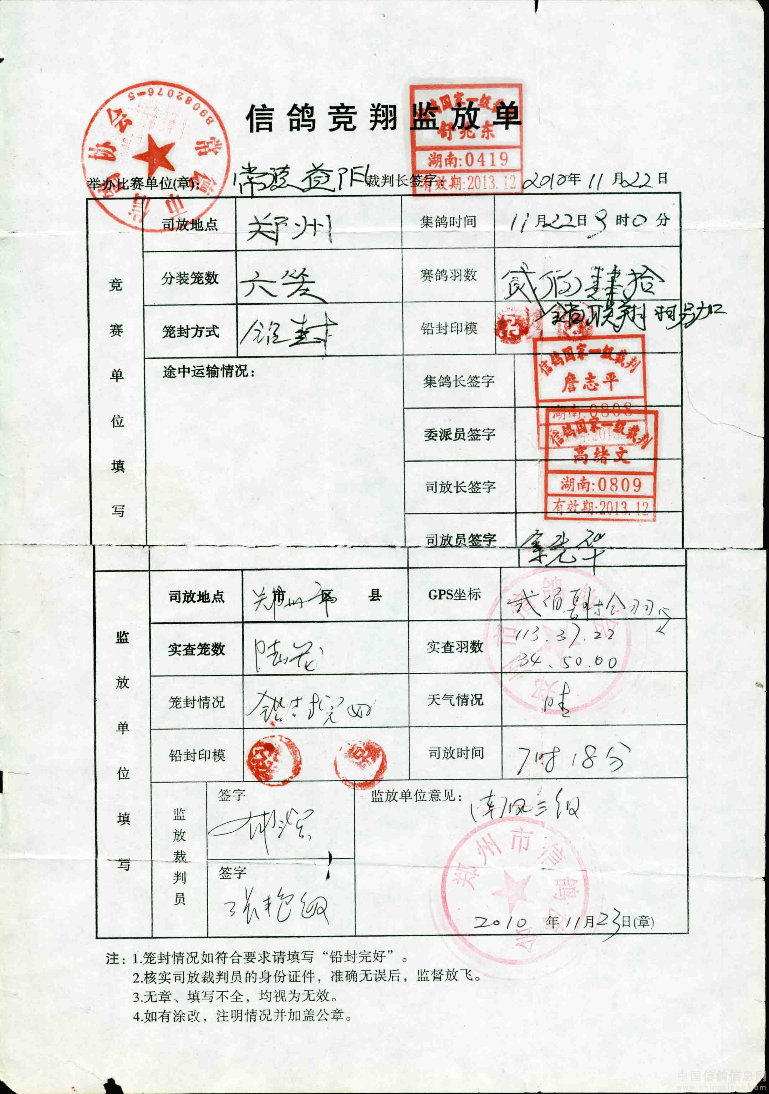 司放地点:山东菏泽(东经:115.30.02 E 北纬:35.13.50 N) 司放时间:2010-11-23 07:18:00 天气状况:晴 北风 一级 集鸽羽数:660 羽 ---------------------------------------------------------------------------- 名次 会员姓名 棚号 足环号码 归巢时间 空距(千米)分速(米/分) ----------------------------------------------------------------------------