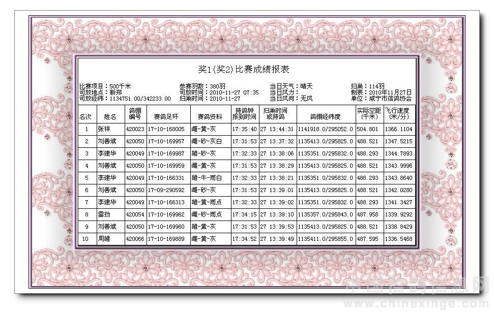奖鸽前10名(10元)