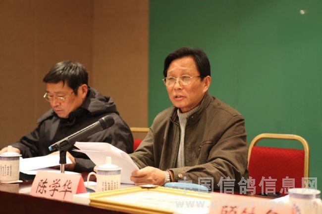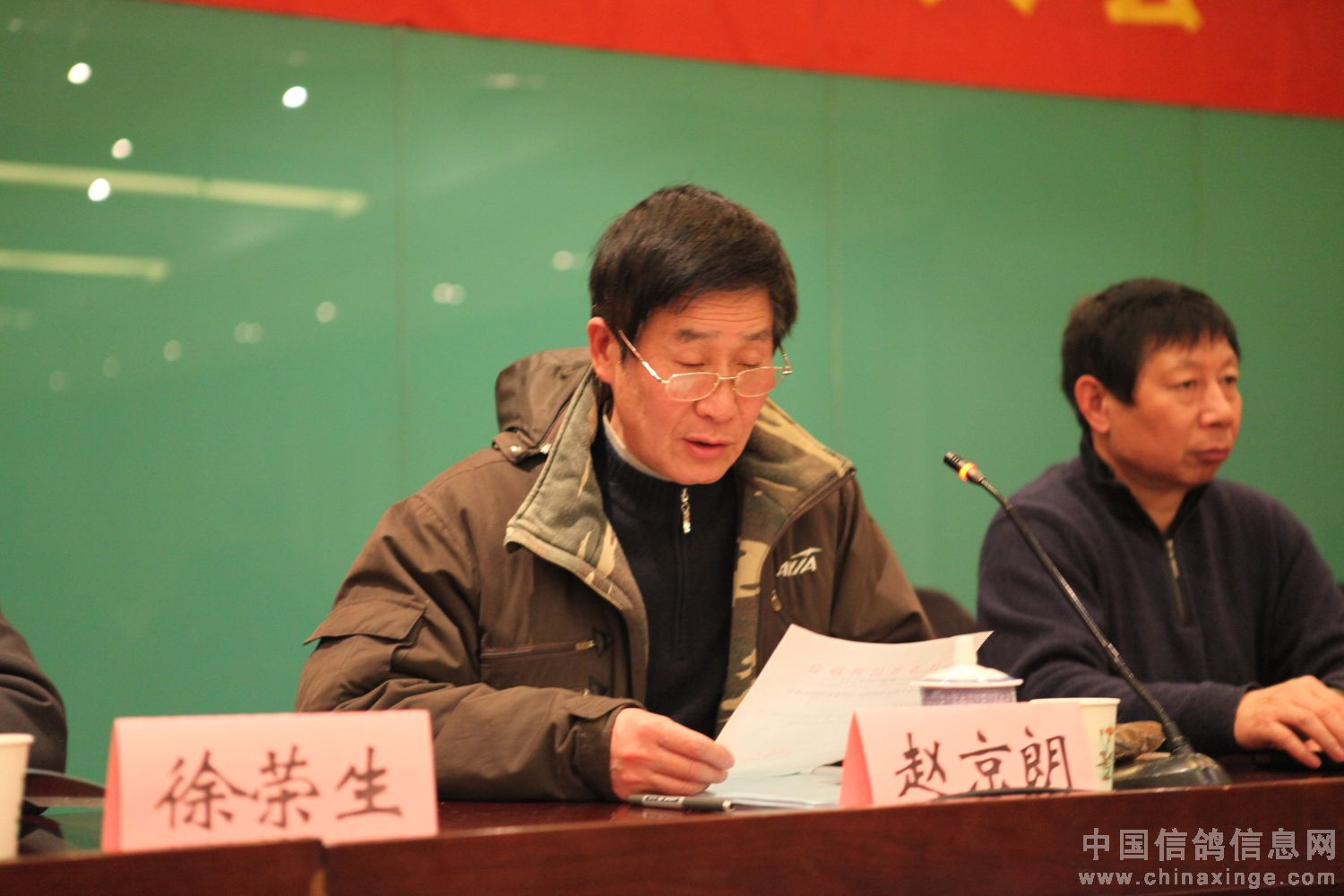 省鸽协副会长、南京市信鸽协会主席、南京市体育局原纪检组长赵京朗宣布省鸽协关于批准授予四位同志为中级育翔师。