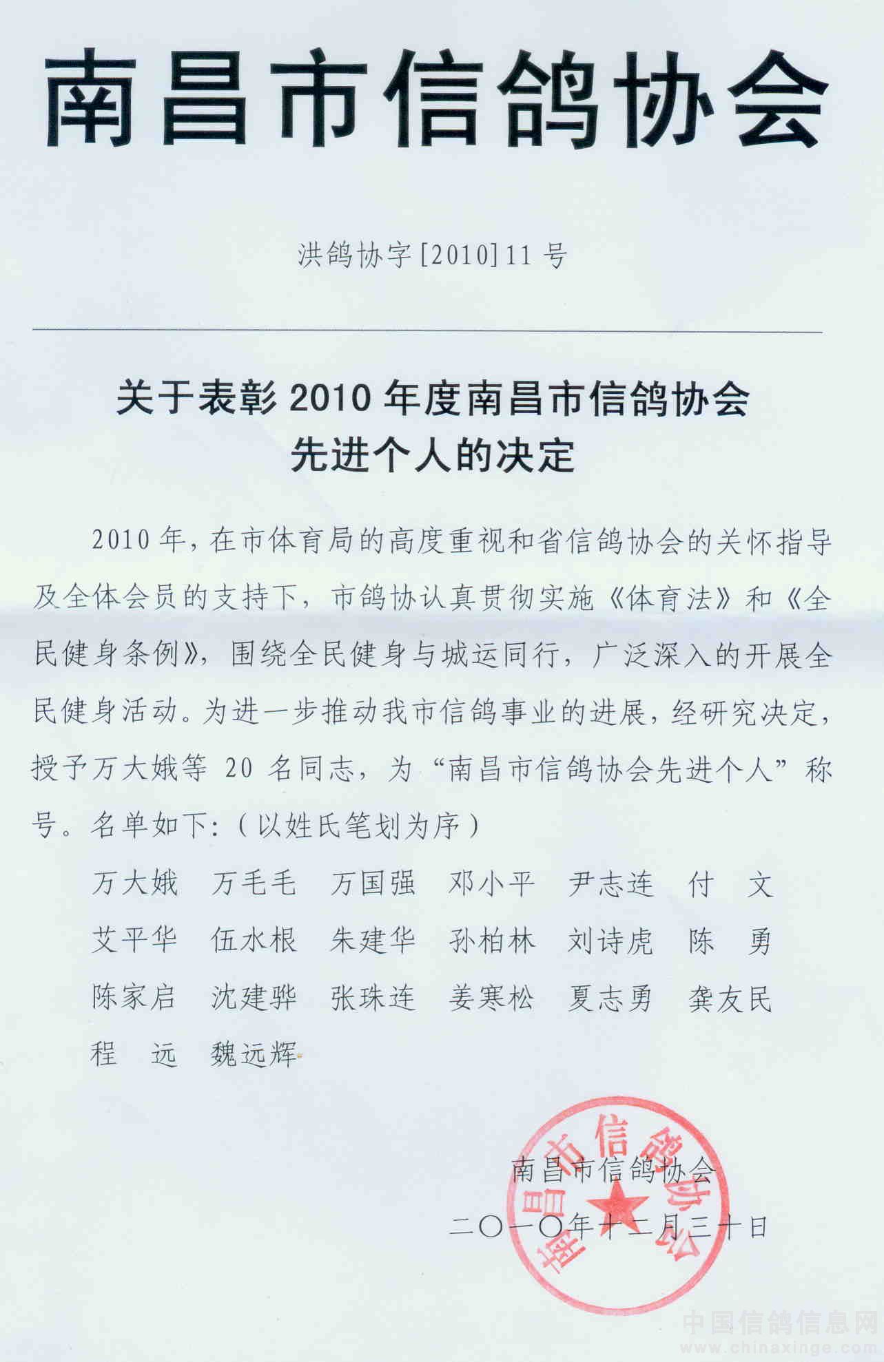 关于表彰2010年度南昌市信鸽协会先进个人的决定