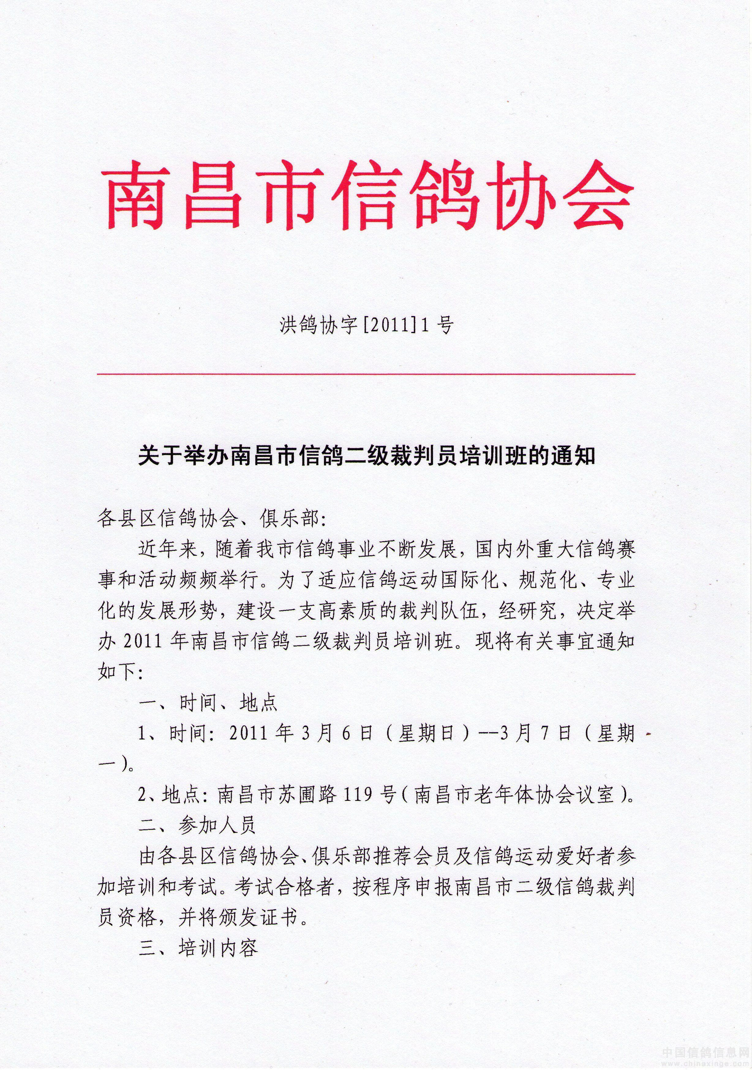 关于举办南昌市信鸽二级裁判员培训班的通知