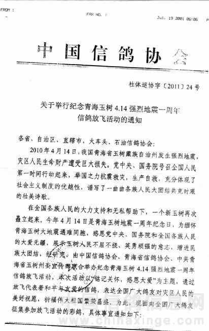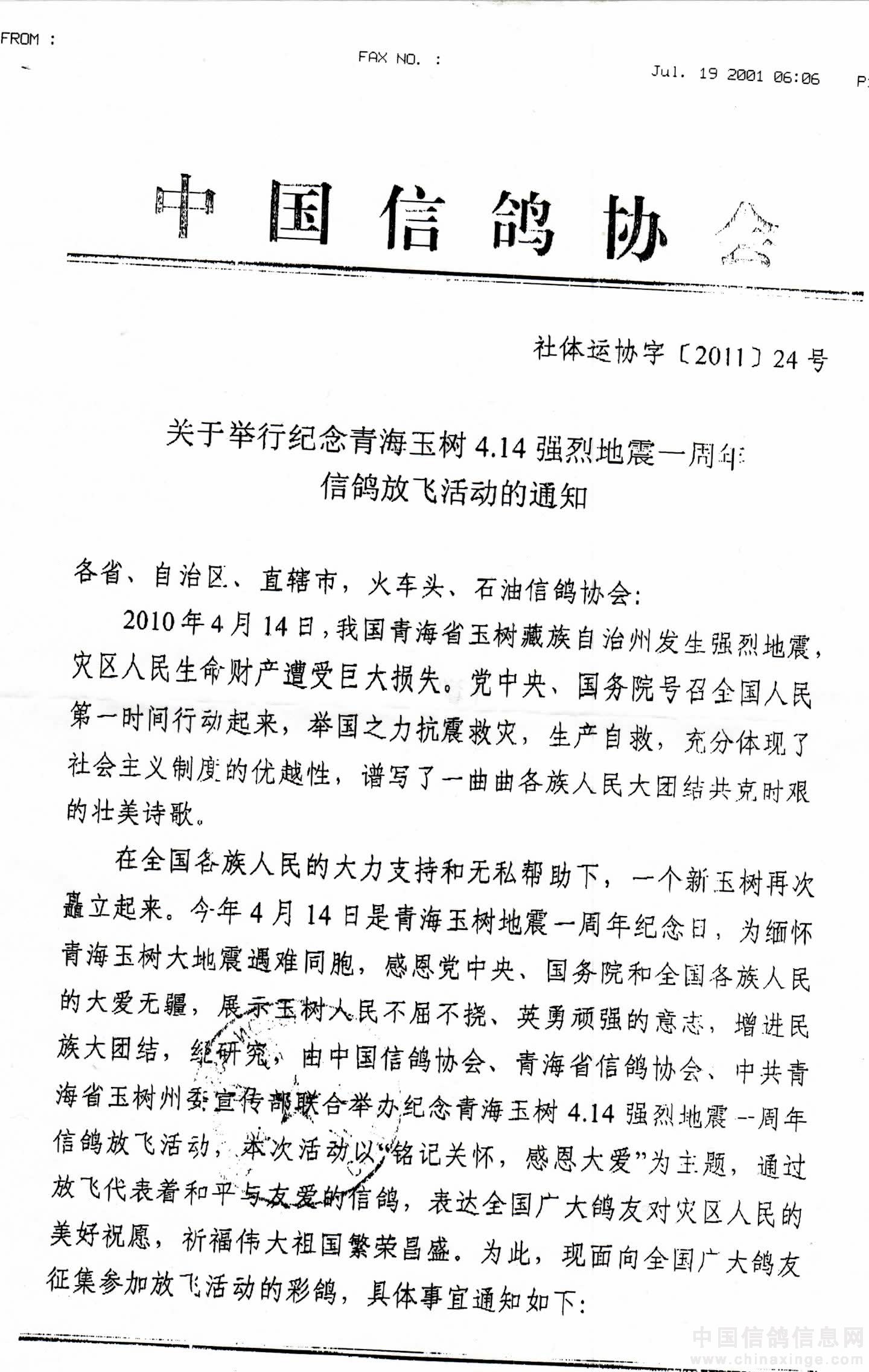 关于举行纪念青海玉树4.14强烈地震一周年信鸽放飞活动的通知