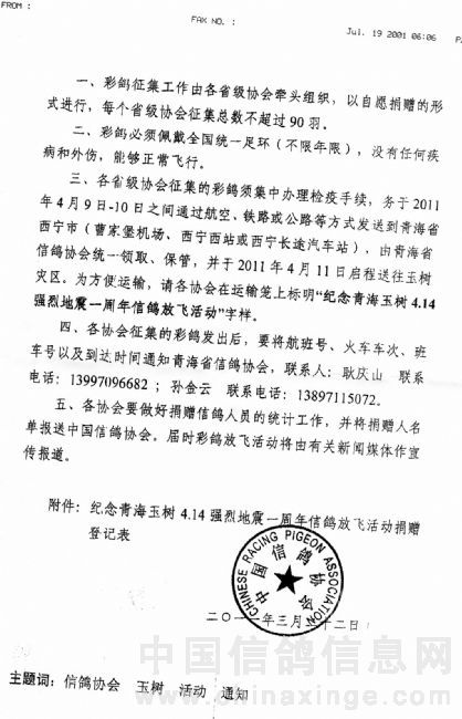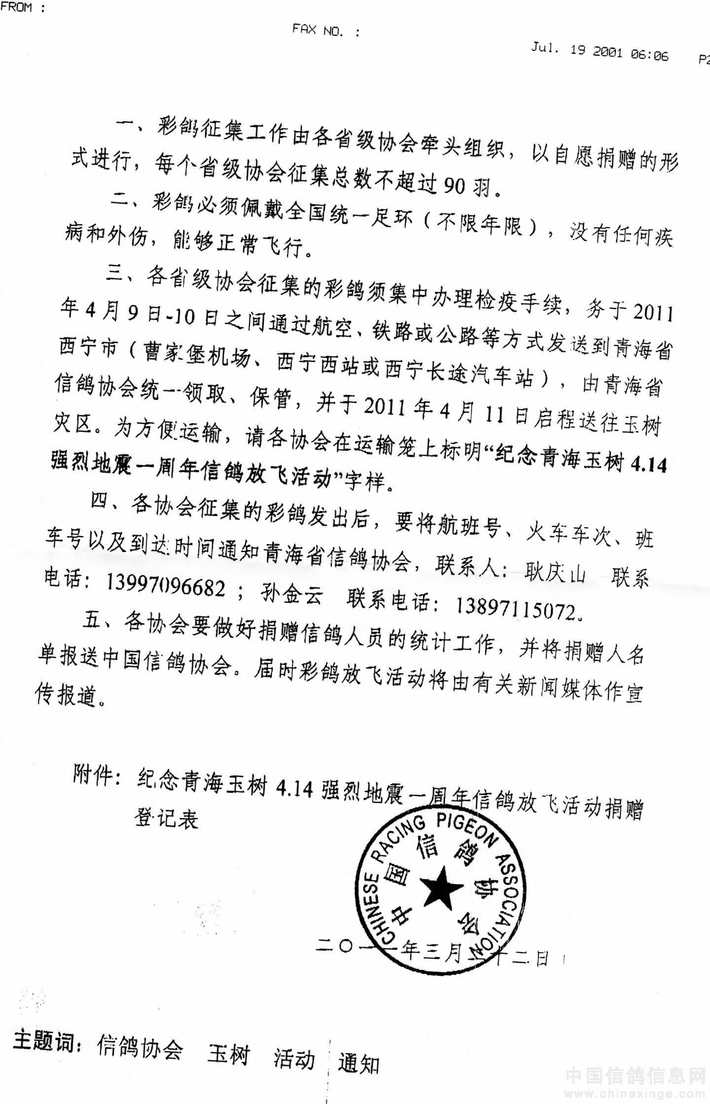 三、各省级协会征集的彩鸽须集中办理检疫手续,务于2011年4月9日-10日之间通过航空、铁路或公路等方式发送到青海省西宁市(曹家堡机场、西宁西站或西宁长途汽车站),由青海省信鸽协会统一领取、保管,并于2011年4月11日启程送往玉树灾区。为方便运输,请各协会在运输笼上标明“纪念青海玉树4.14强烈地震一周年信鸽放飞活动”字样。
