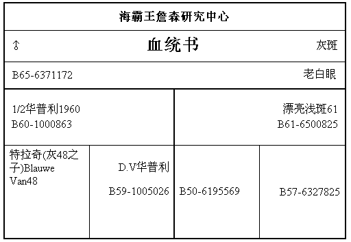 它是“67年出生的浅斑”和“62年出生的深格斑”B62-6130361的全兄弟。它的父亲是B60-1000863。这羽鸽子来自于华普利。华普利从詹森兄弟处购买了一羽“灰48”之子B52-6384936,这羽鸽子在比赛中的表现非常好,因此华普利送给詹森兄弟一羽他自己的雄鸽,这羽雄鸽共赢得了两百万比利时法郎并被命名为“保斯”B50-1195569,和它配对的是华普利最好的雄赛鸽的女儿B59-1005026。“保斯”的父亲是昂古莱姆省赛冠军B44-306686,母亲是圣维仙国家赛冠军B47-606686。B59-1005026的母亲是纯凡?登?布什血统的“年轻公主”B57-6327825,它是“56年出生的王子”的女儿,也是著名的“王子的女儿”B61-6643537的全姐妹,后者是卡尔?慕利门的“老凡?登?布什”B67-6729926的母亲。由于拥有这些著名的血统,这羽来自华普利的天才雄鸽踏上了成功之路,获得了许多冠军。它成为著名的“哈夫华普利”,它与“61年出生的漂亮浅斑”B61-6500825配对育出了“老白眼”和许多优秀的鸽子。