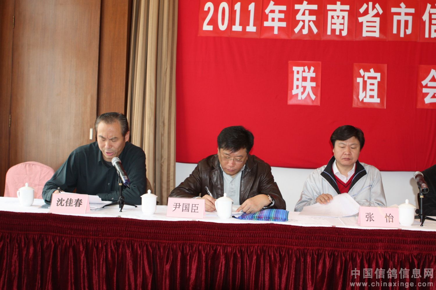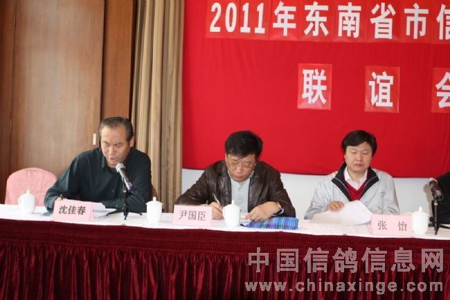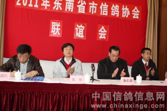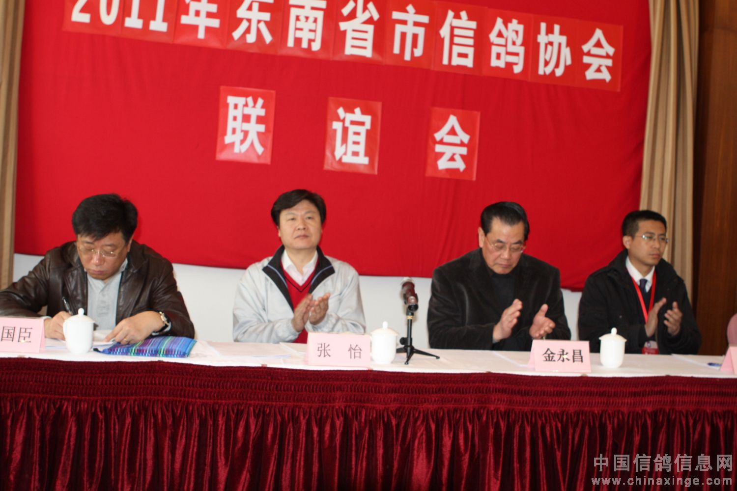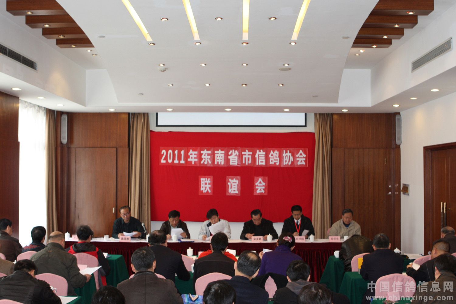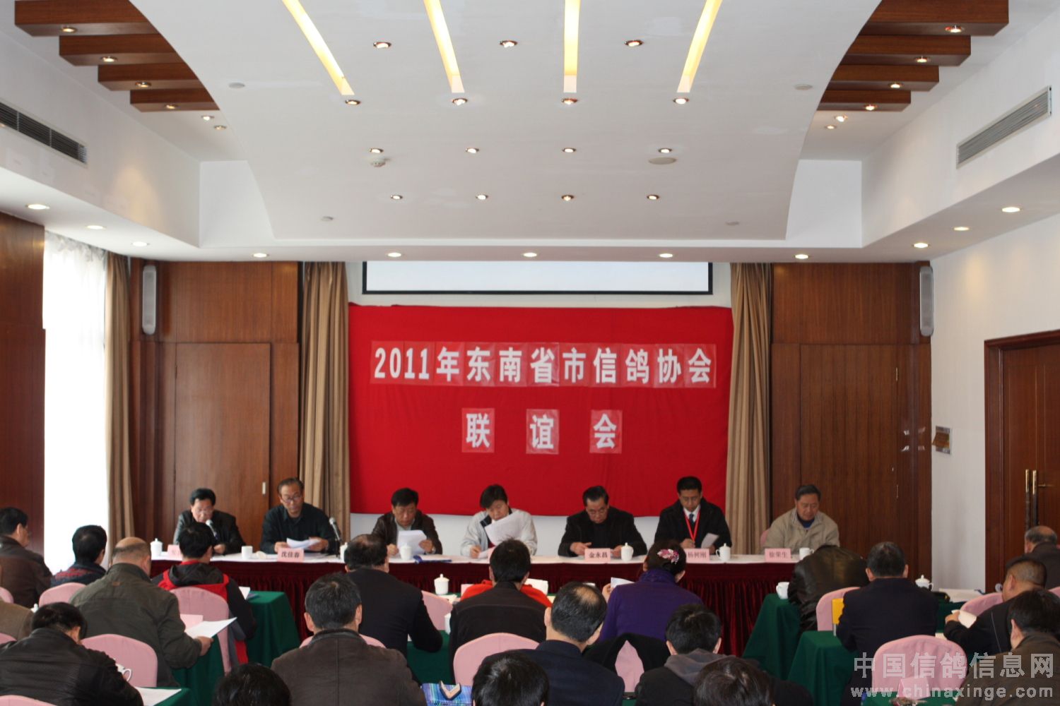由上海市信鸽协会承办的2011年东南省市信鸽协会联谊会,于3月26日在上海召开。来自上海、江苏、浙江、安徽、山东、福建、江西、广东、湖北、湖南等9省1市的鸽协代表以及《中华信鸽》、《翱翔》等媒体记者共计41人参加会议。国家体育总局社体中心副主任张怡,国家体育总局社体中心业务三部主任尹国臣,中国信鸽协会秘书长杨树刚,中国信鸽协会顾问、上海市信鸽协会名誉主席金永昌,江苏省信鸽协会主席徐荣生等出席会议并在主席台就坐。会议由上海市信鸽协会秘书长沈佳春主持。