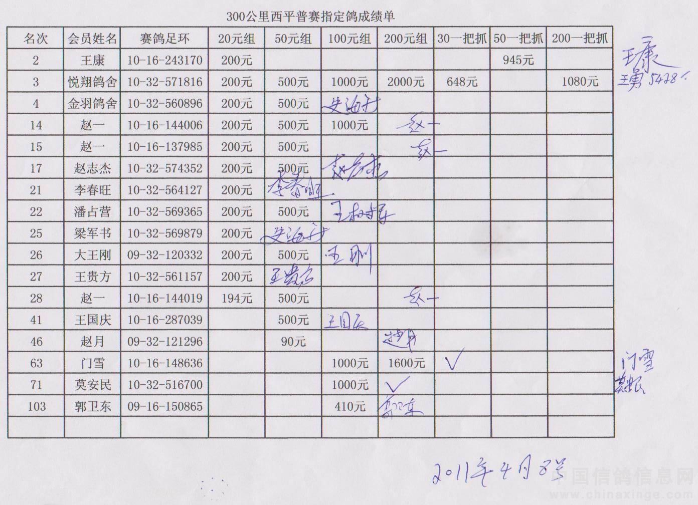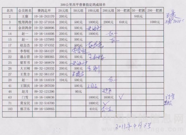 300公里西平站指定鸽成绩