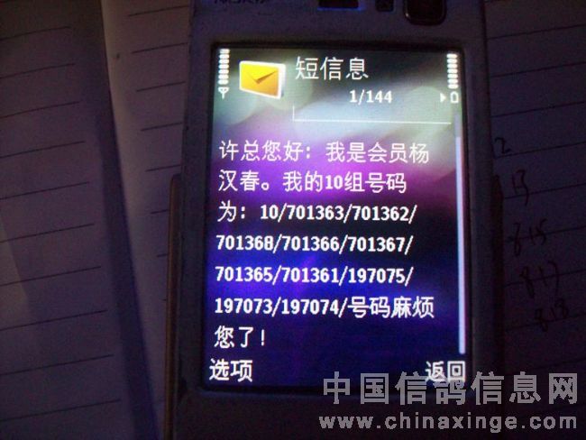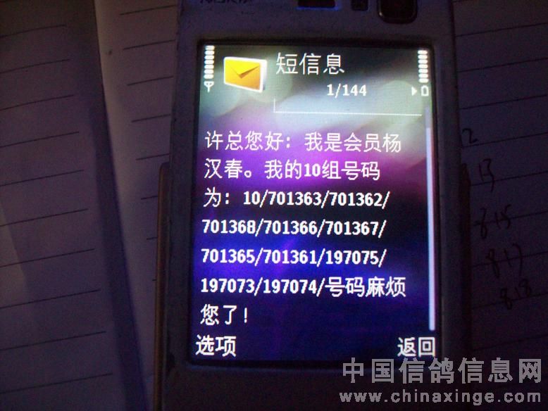 射阳鸽友杨汉春通过短信传来,感谢杨哥对小许的支持