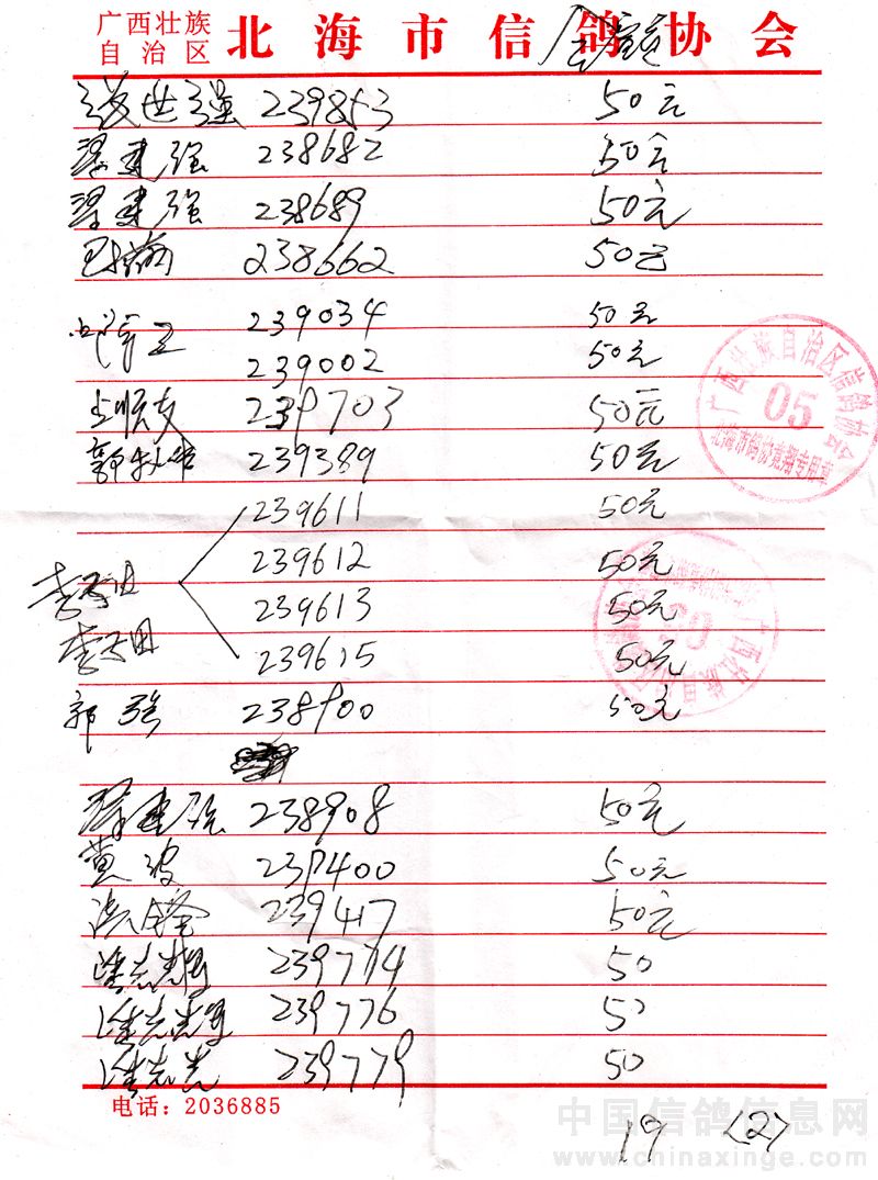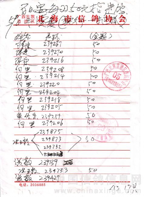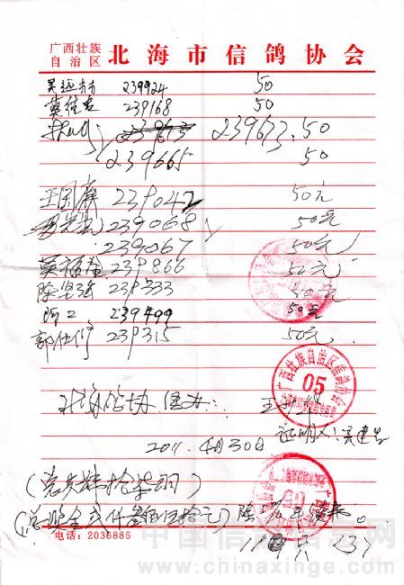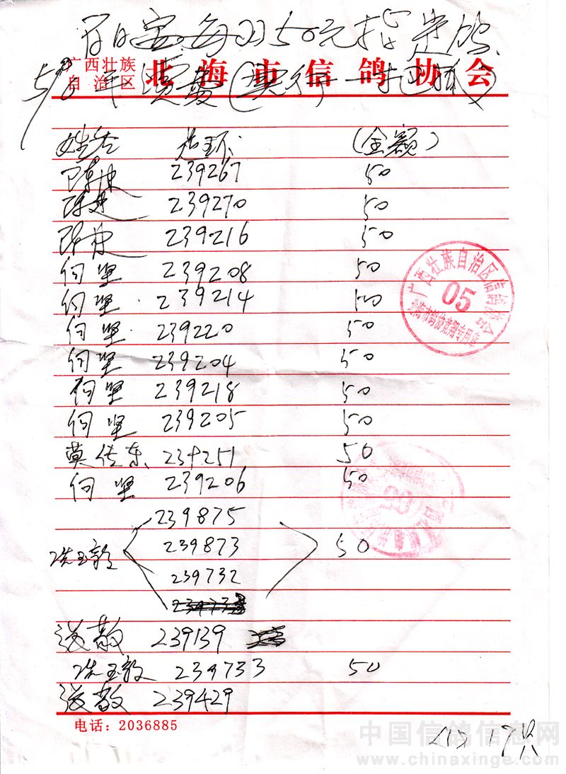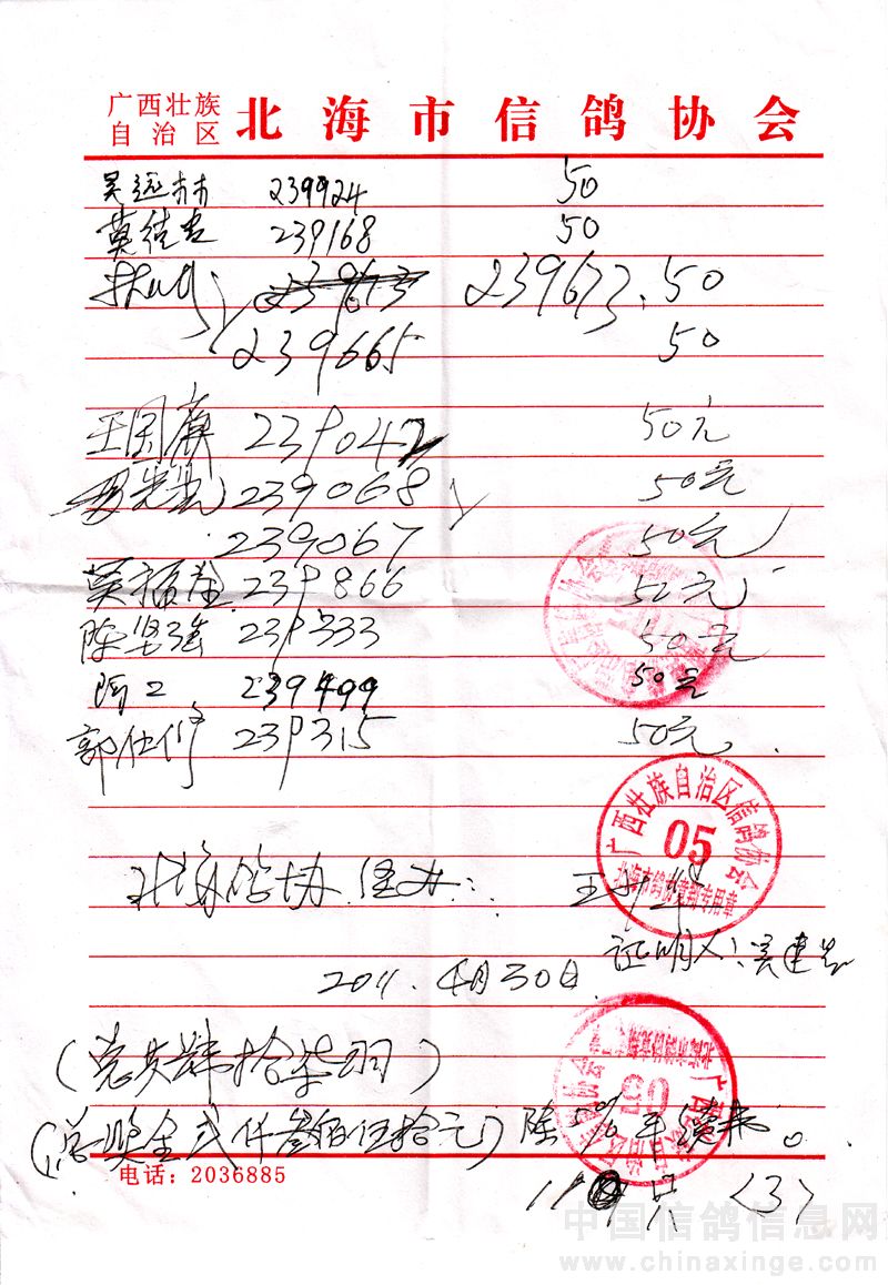 广西北海市信鸽协会2011年上半年百日赛50元组指定鸽名单
