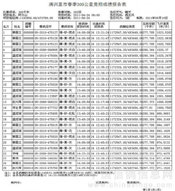 满洲里市春季300公里竟翔成绩单