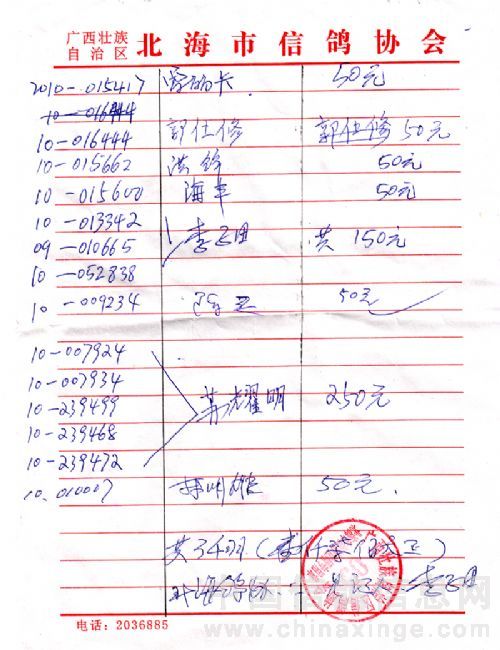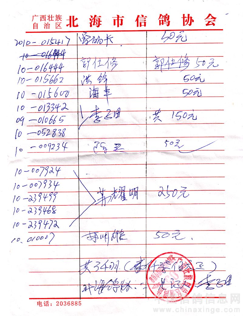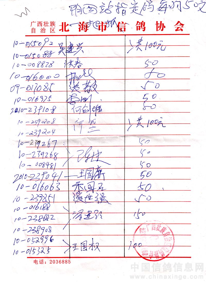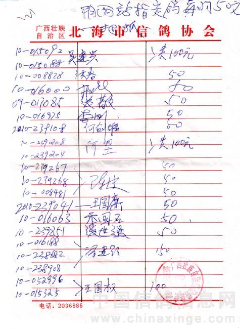 广西北海市信鸽协会2011年上半年阳西站50元组指定鸽名单