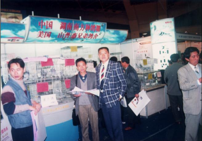 1998年北京国际鸽展舒兆东、赵壁龙在南方展厅前合影。