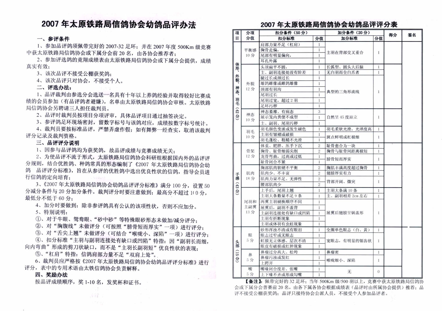 本品评办法依据国内外信鸽协会品评规则,以及获奖信鸽常具形态编制。太原铁路局信鸽协会在2007年试行。