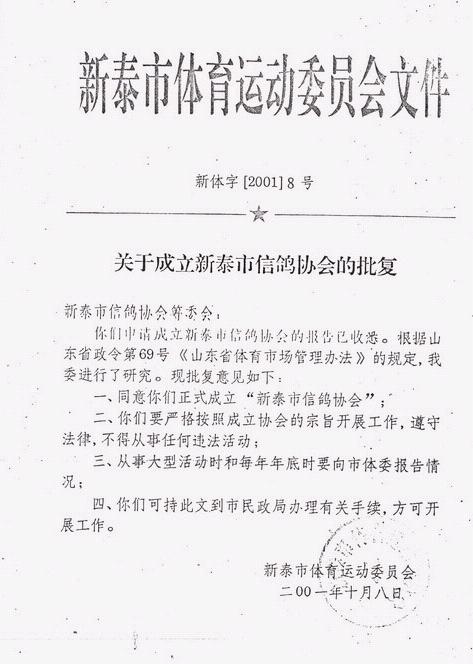 新体字(2001)8号关于同意成立新泰市信鸽协会的批复