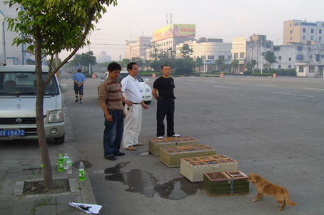 2008年7月6日新津竞翔赛。新津县信鸽协会主席及裁判亲临现场验鸽、并监督放飞。