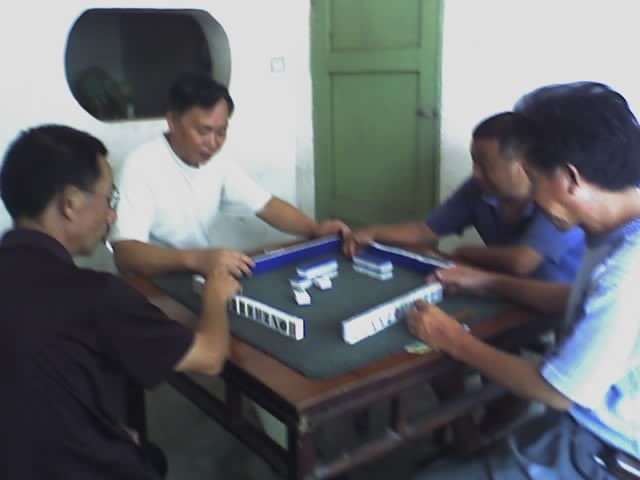 身穿白色上衣的是鸽协会主席,正在和鸽友一起玩牌。