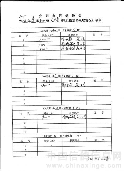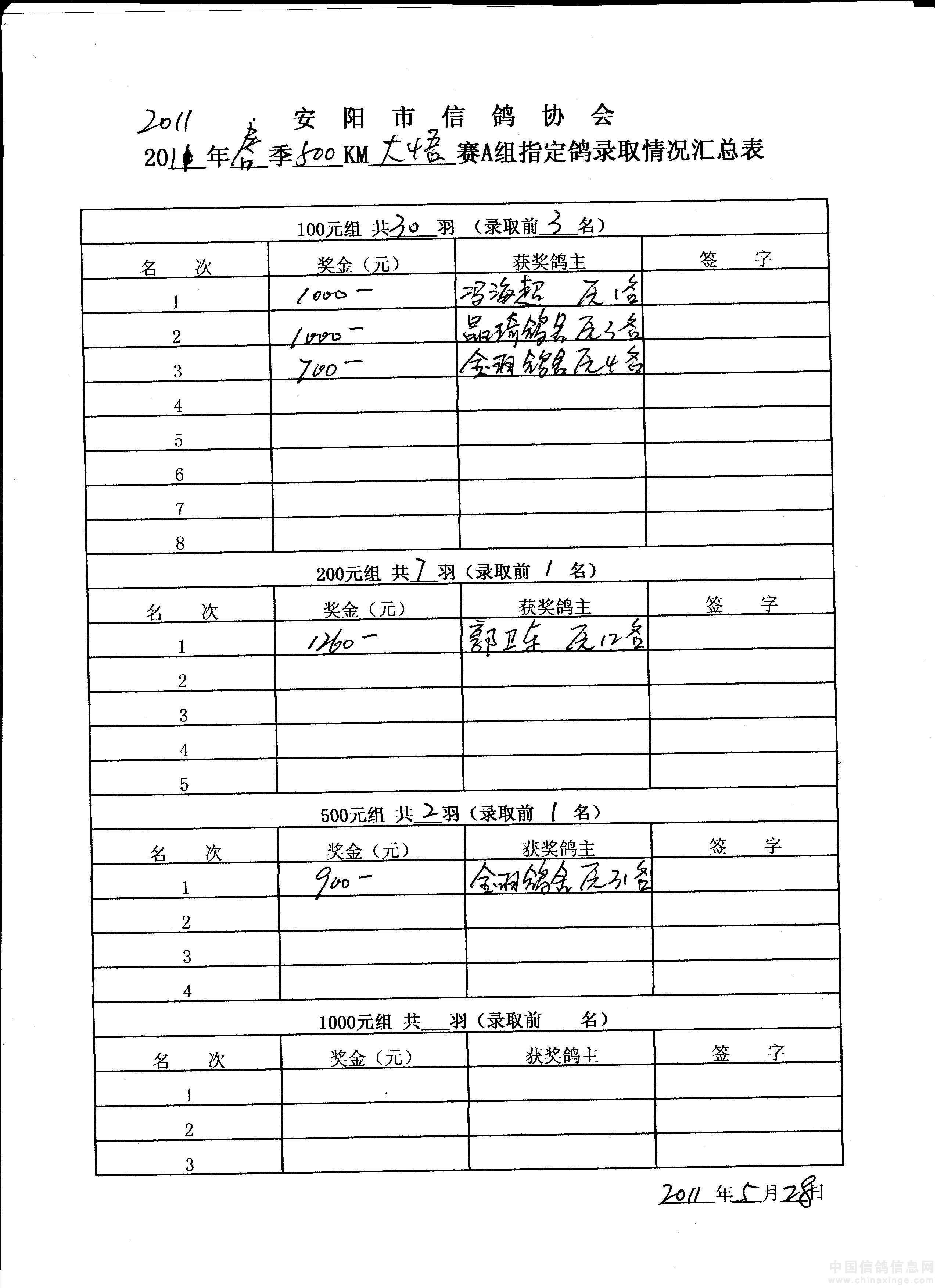 2021秋安阳市信鸽协会500公里大悟站指定获奖明细(临时)