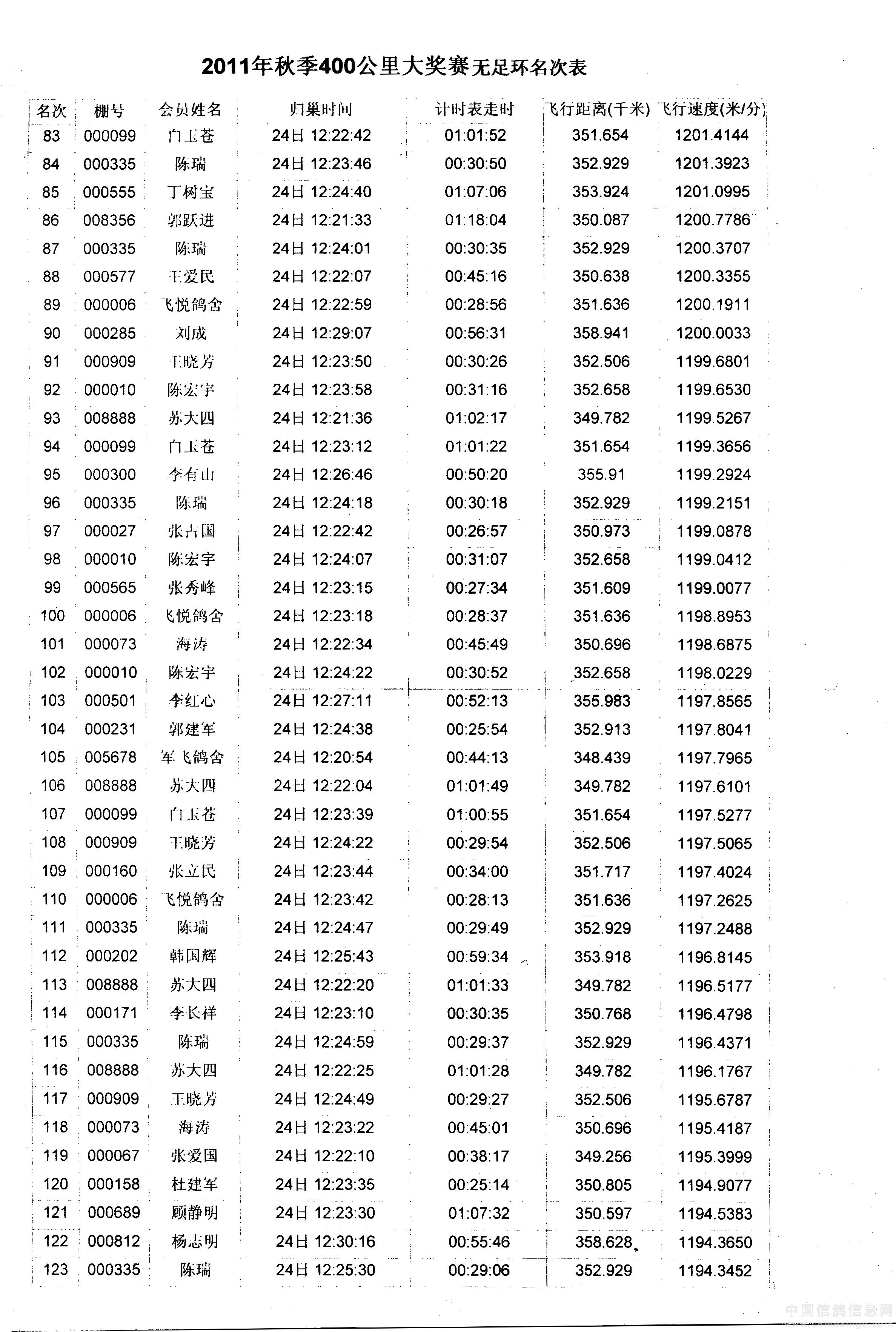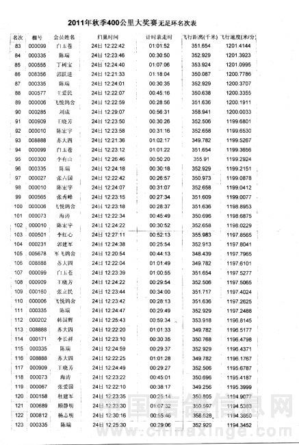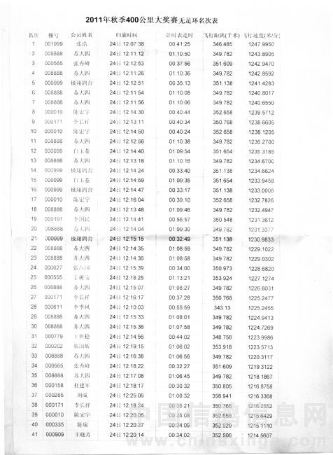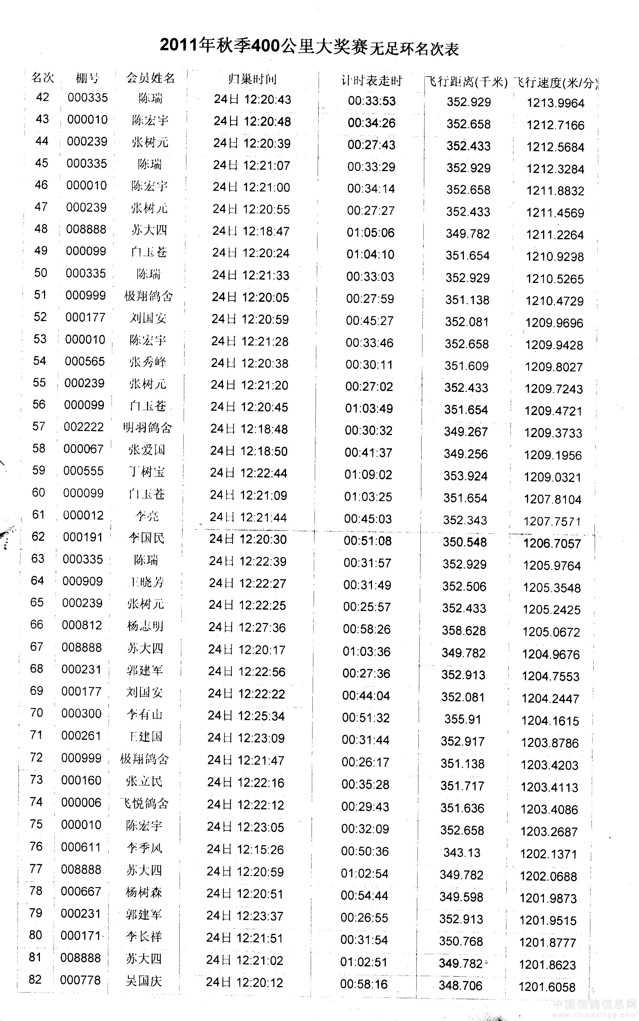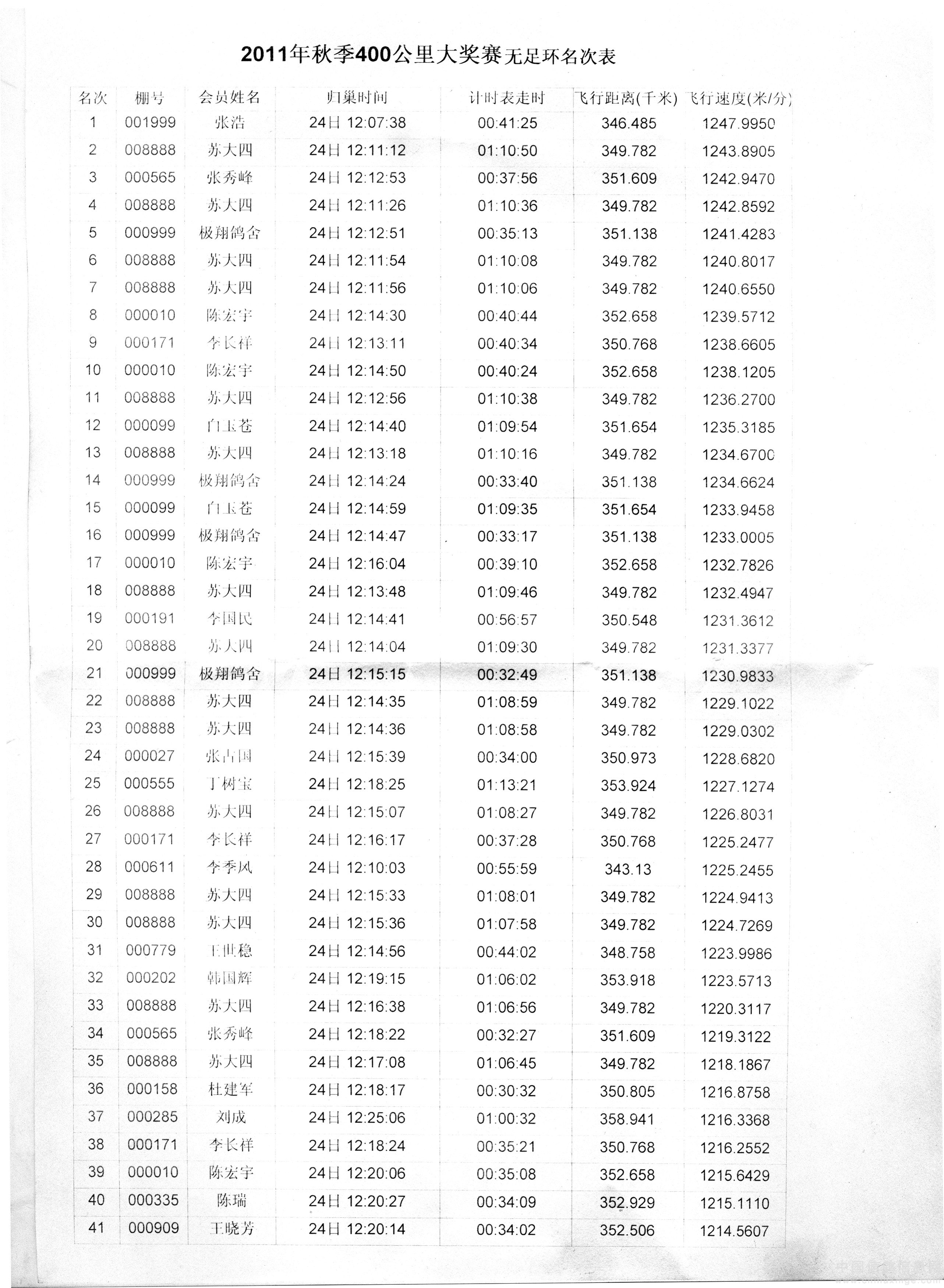 赤峰市红山区信鸽协会2011年秋9月24日400公里成绩: