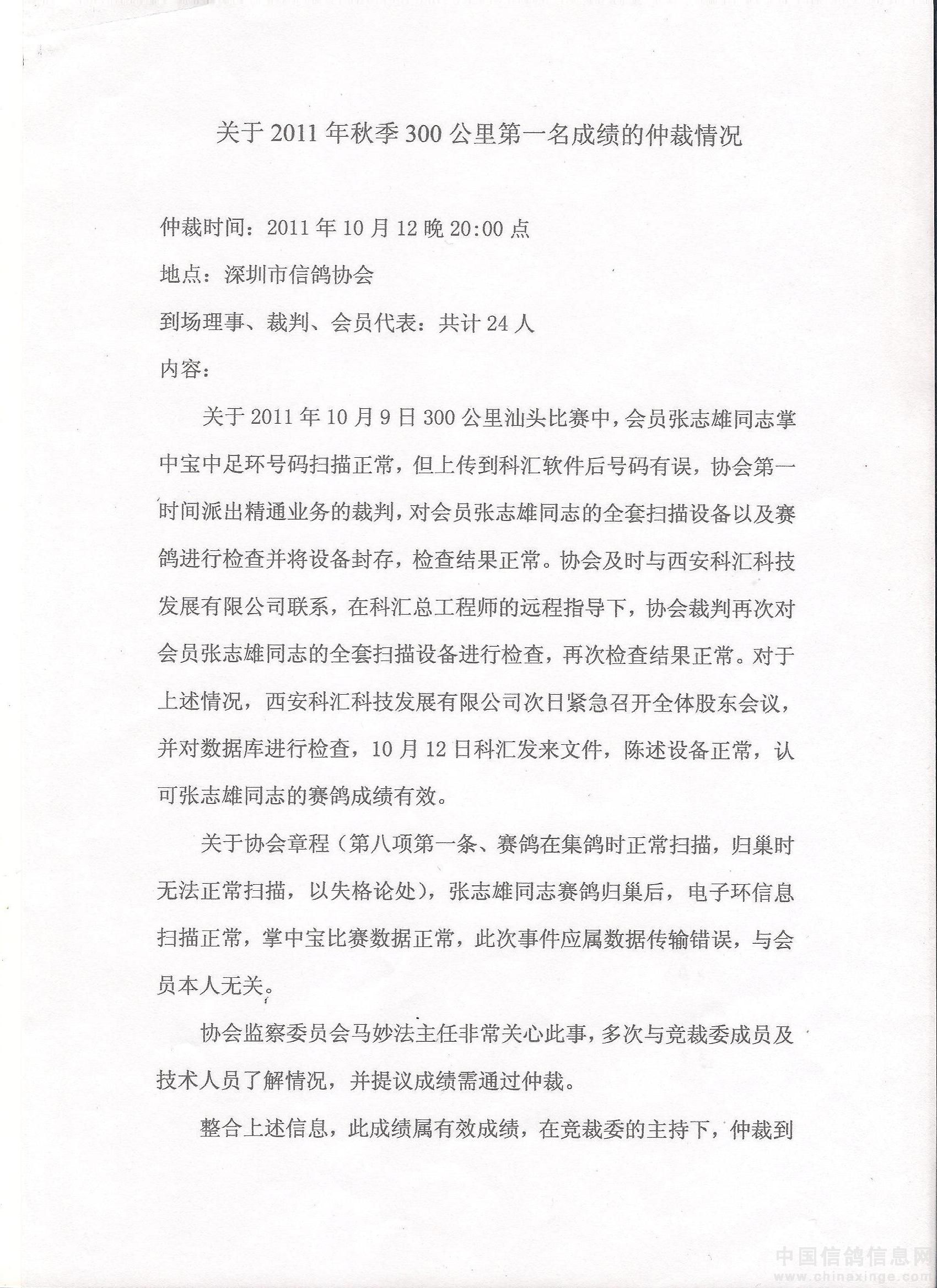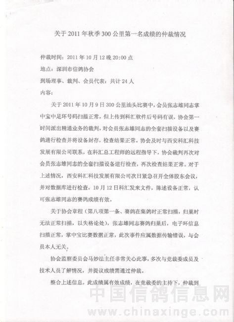 关于2011年秋季300公里第一名成绩的仲裁情况