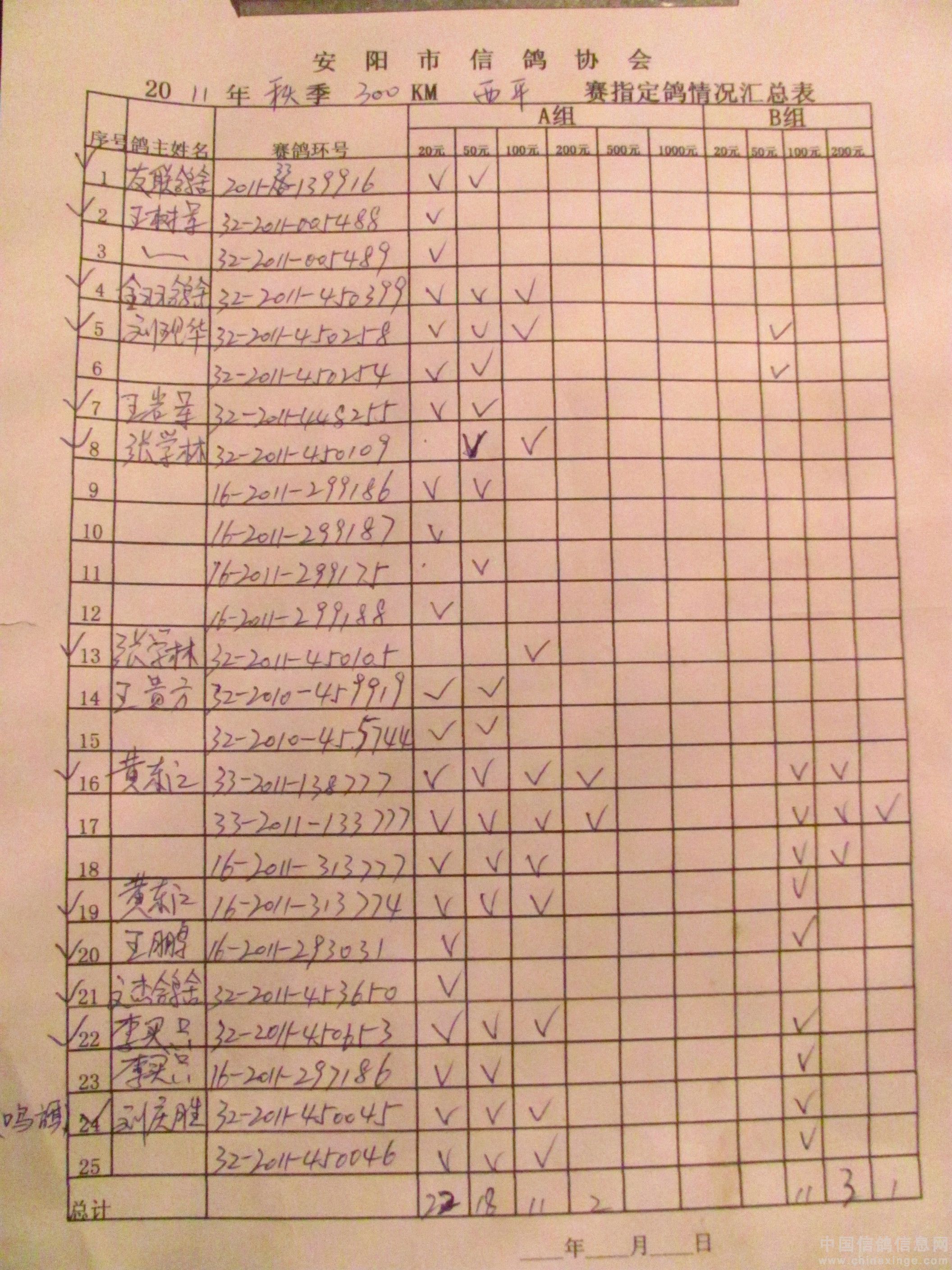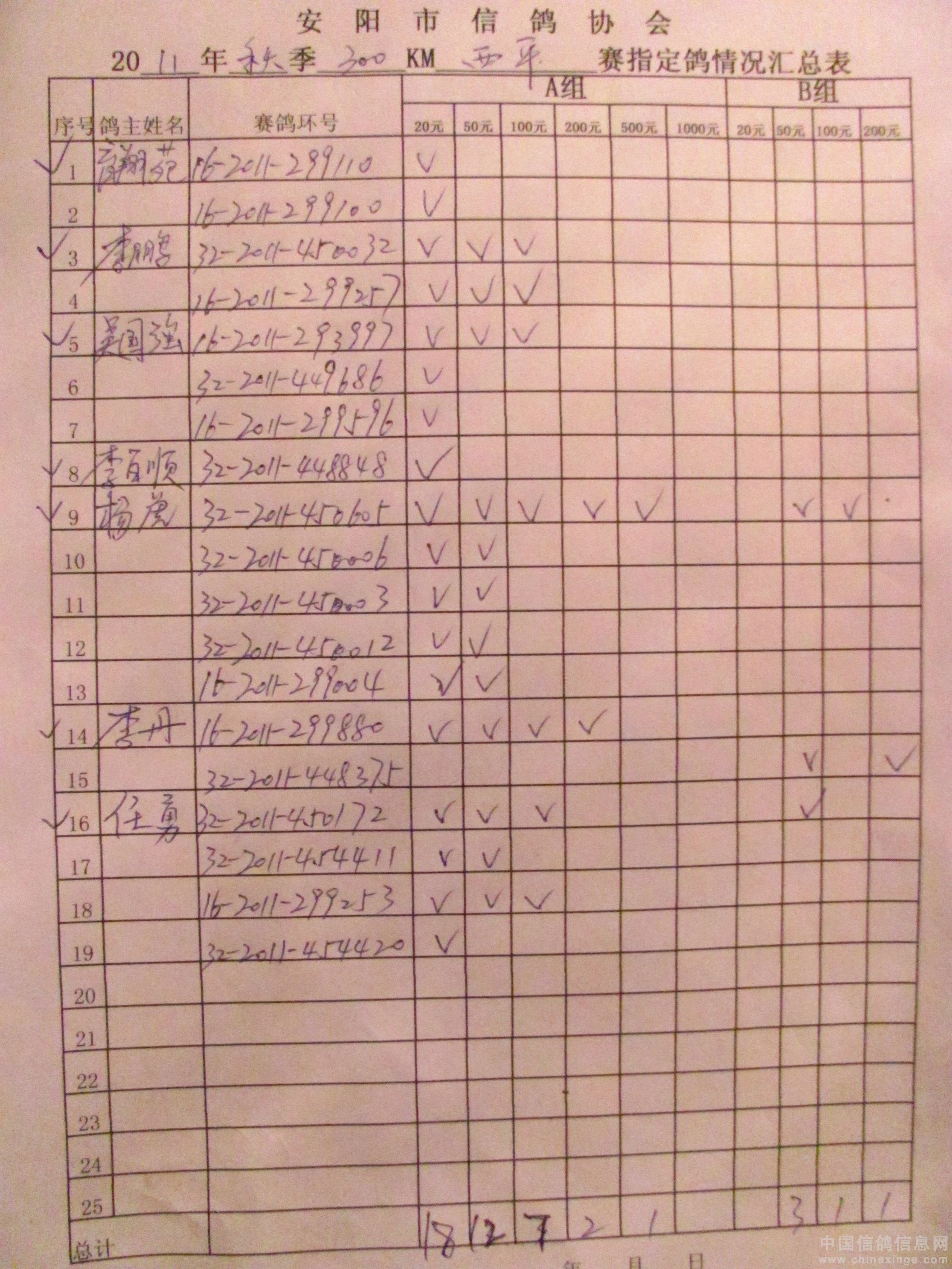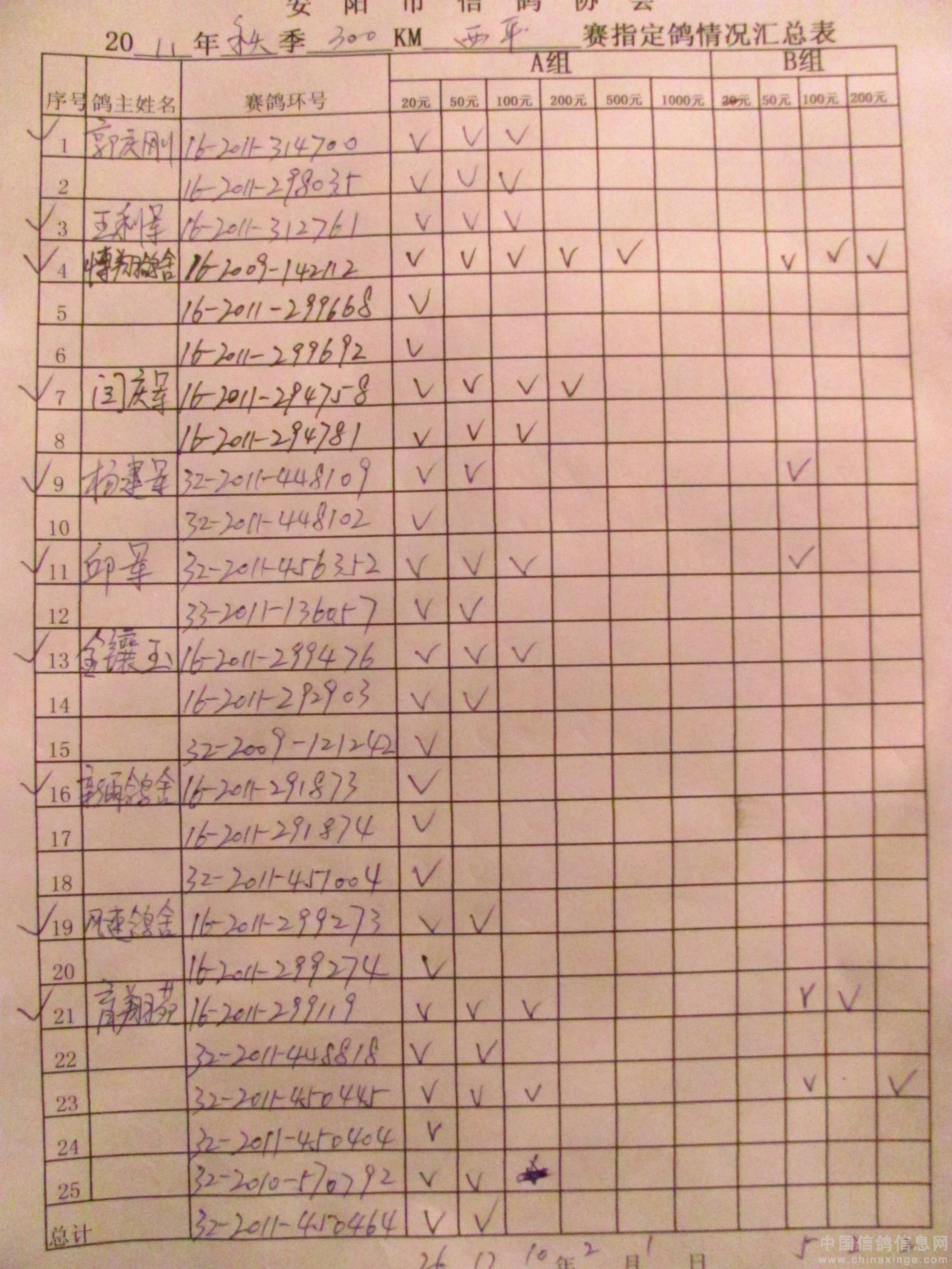 会员任勇保管指定鸽档案 靳增玉保管参赛档案