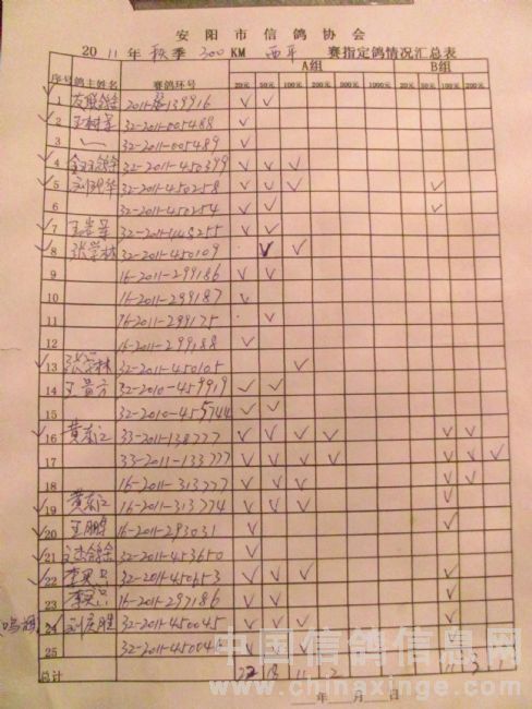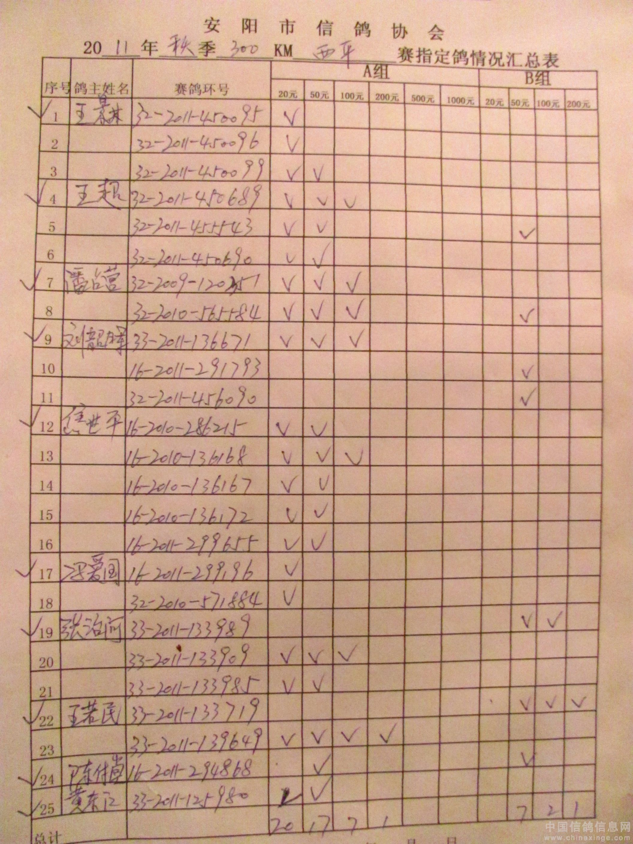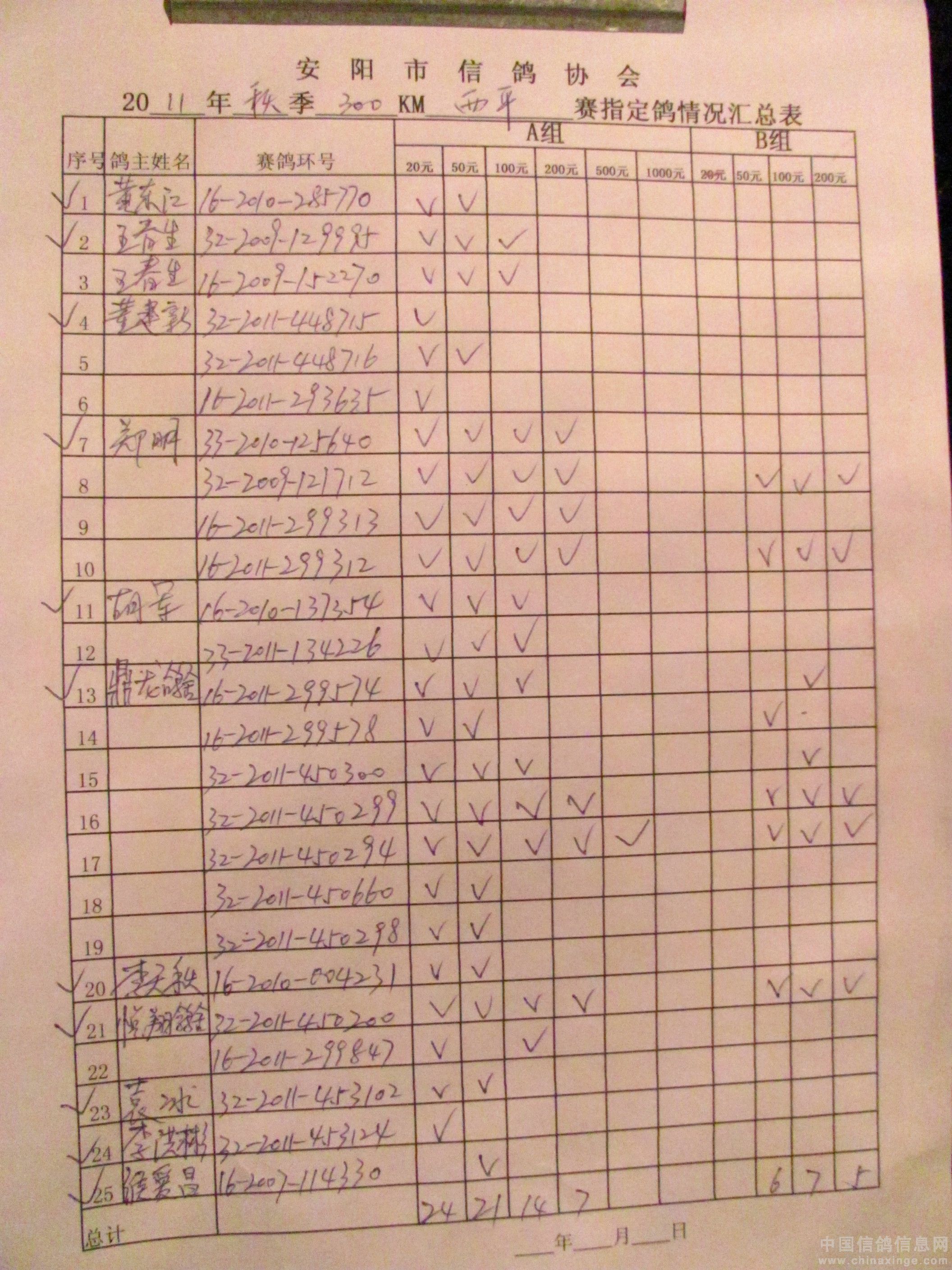 会员任勇保管指定鸽档案 靳增玉保管参赛档案