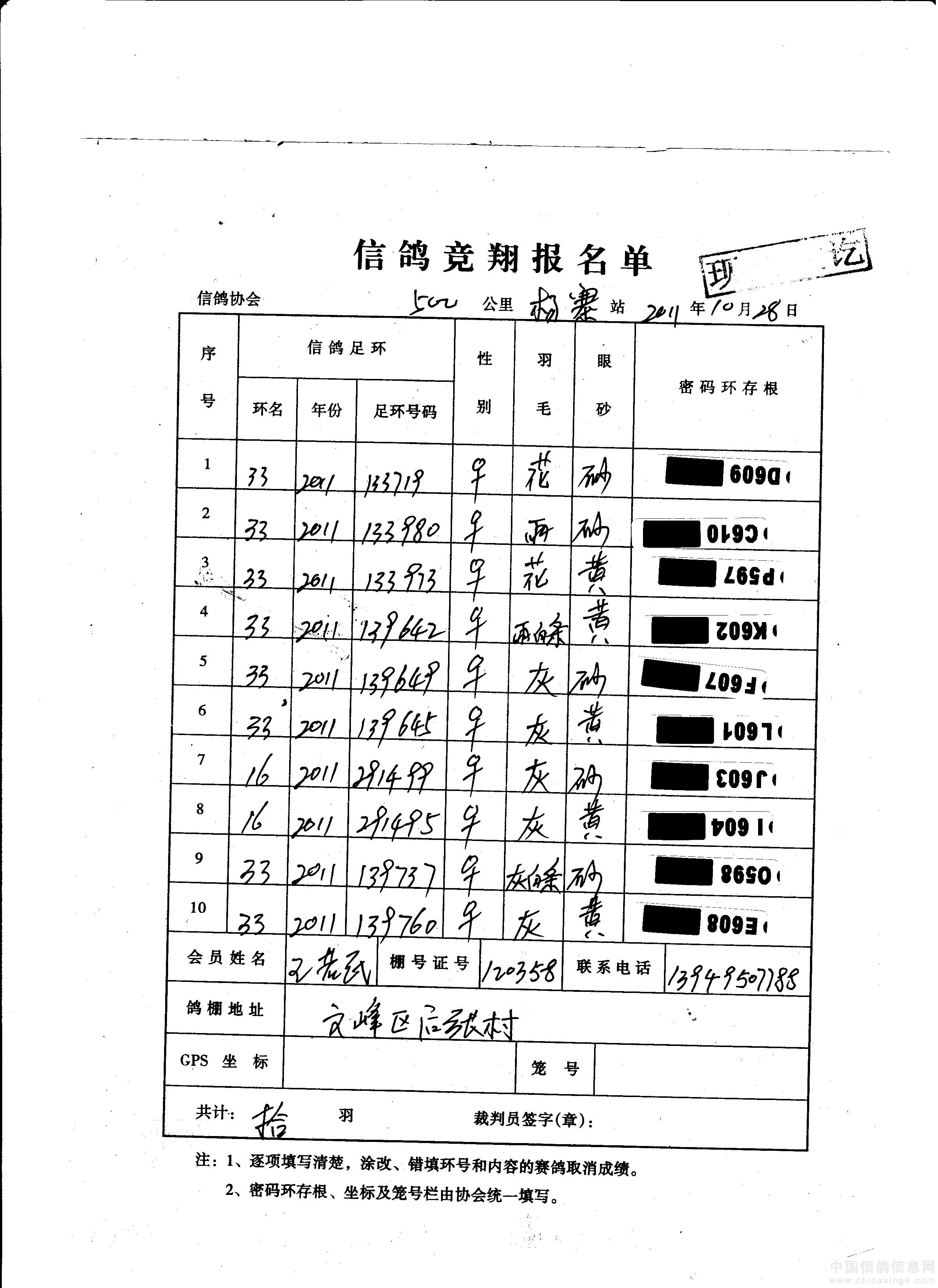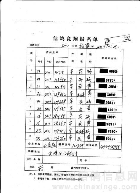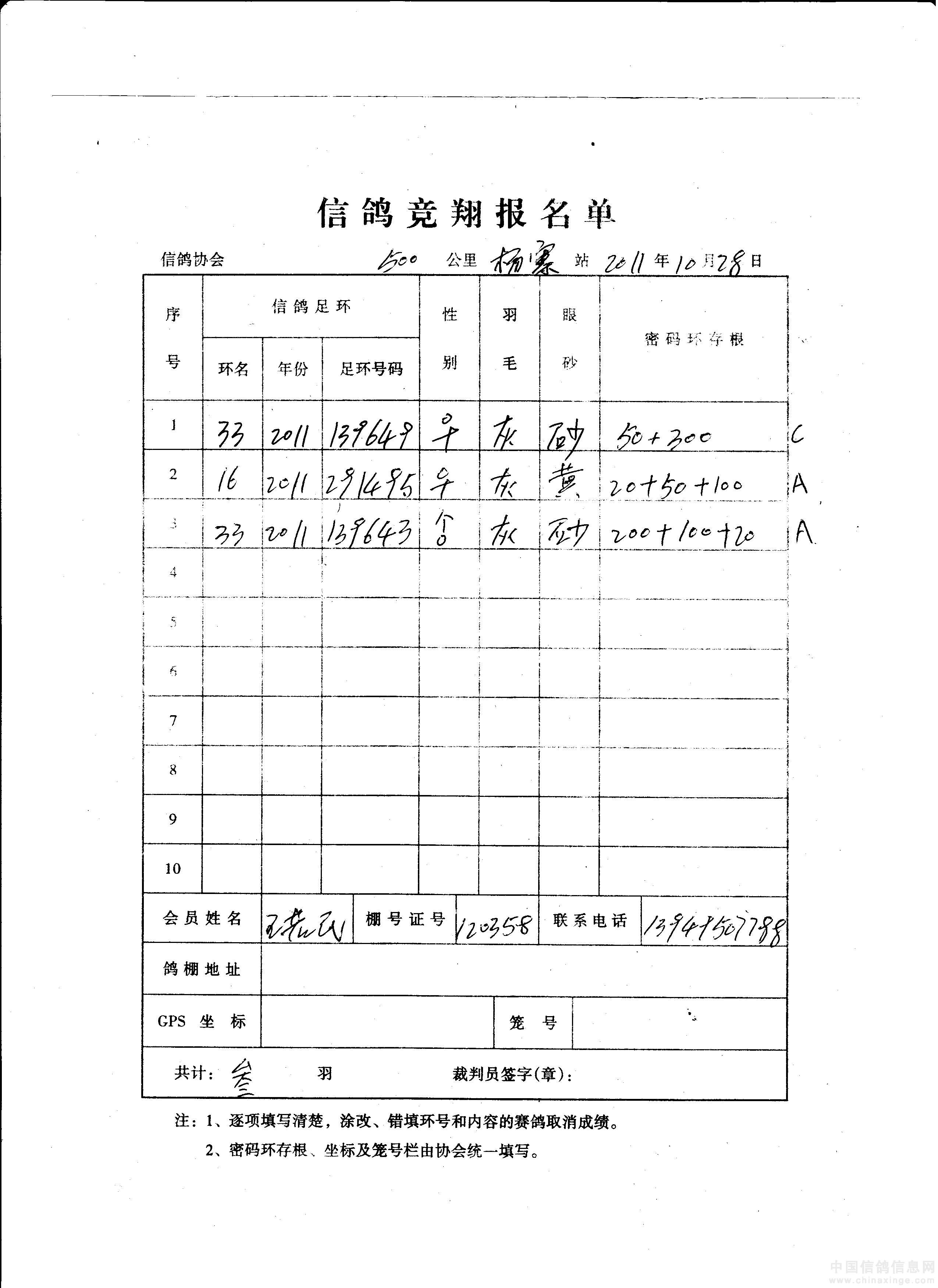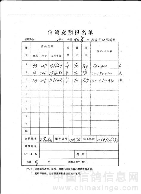 500公里杨寨指定鸽比赛中,因工作人员笔误,将会员王若民环号为2011-33-139649的指定鸽誊写为2011-32-139649,有细心会员发觉并反映到鸽会。经裁判员核对原始单据,确认是工作人员失误造成。经研究决定:会员王若民指定鸽成绩有效,奖金照常发放。由此对鸽友造成的不便深表歉意!鸽会工作在广大会员的监督、支持、理解下,蓬勃发展,再次表示感谢!今后我们将继续改进工作作风,认真仔细,尽量避免出现差错,坚持公平、公正、公开的原则,为鸽友提供更好的竞翔平台。(附:原始报名单、指定鸽报名单)