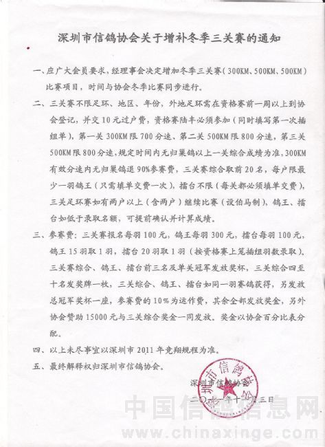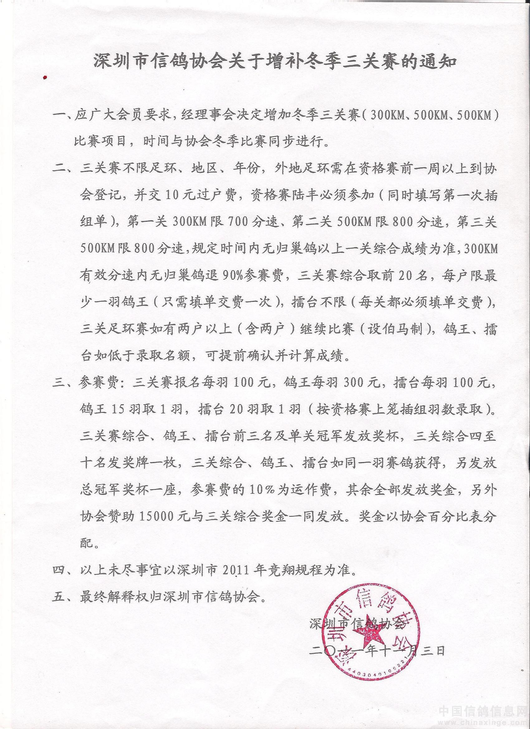 深圳市信鸽协会关于增补冬季三关赛的通知