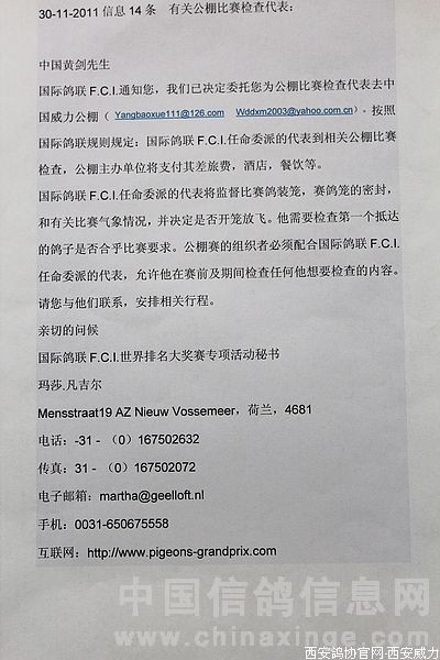 国际鸽联委托监赛代表黄剑
